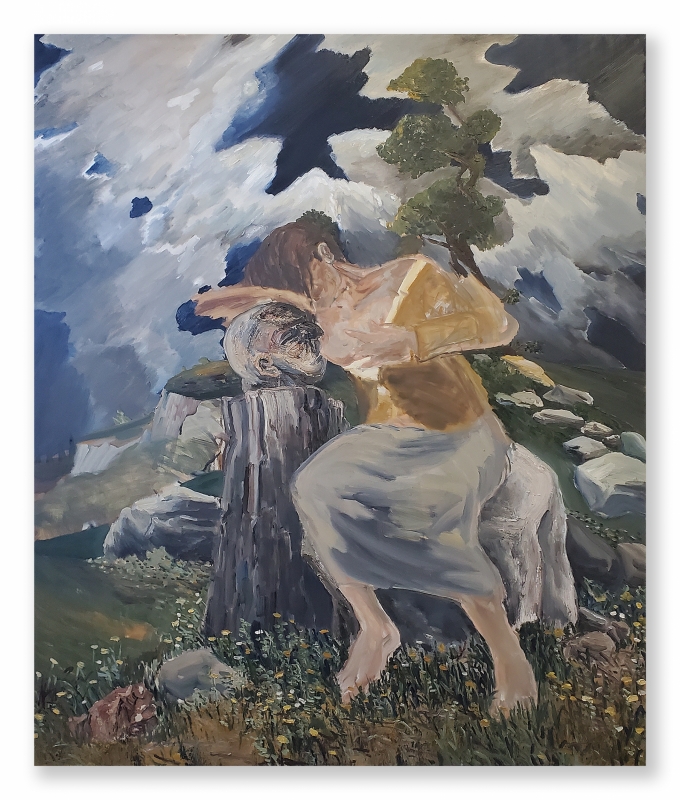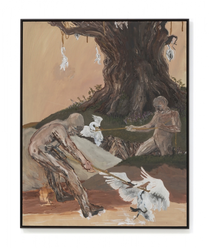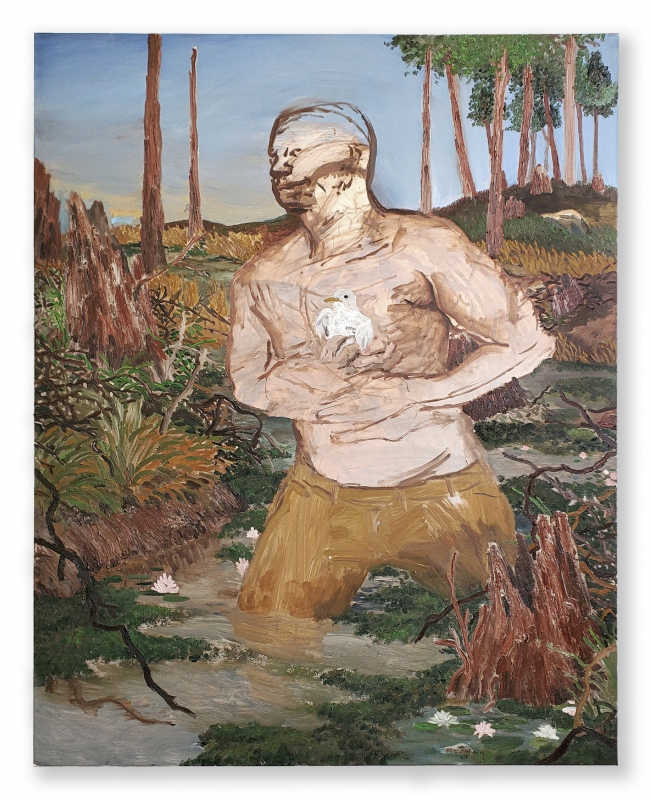 Demarco Mosby (American, b.1991) is a New York City-based figurative painter originally from Kansas City, Missouri. His work is narrative-based and uses the human figure to mirror and reveal the weight and complexity of life's everyday tribulations. By incorporating his symbolic vocabulary of objects like birds, ropes, rocks, and tumultuous landscapes into each composition, Mosby creates layered narratives that aptly visualize the complexity and disorientation of our emotional states.