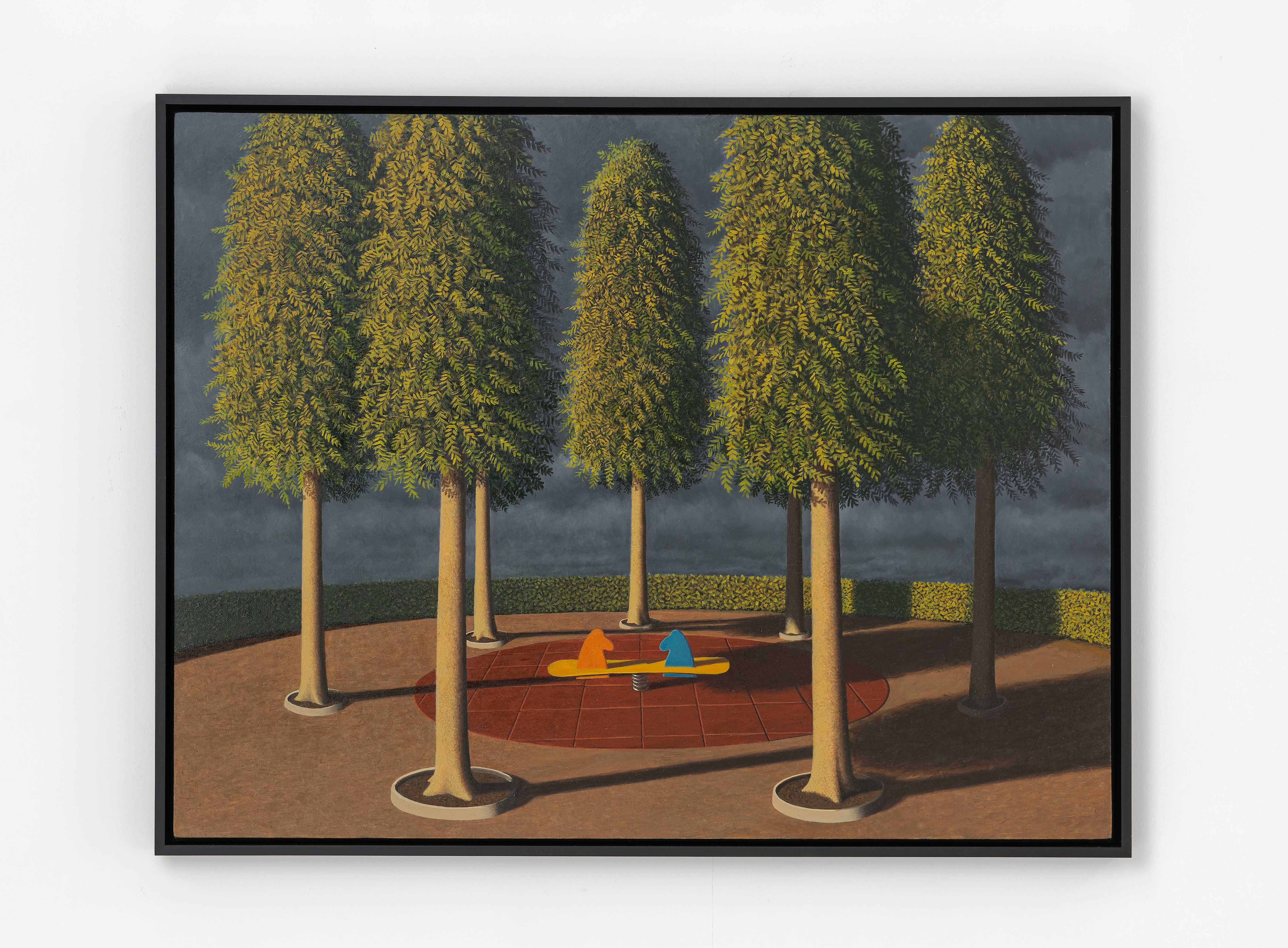 In the seminal painting, Simulazione (2024), the viewer’s perspective has shifted noticeably closer to an observed vacant playground. Here, we are invited — or perhaps lured — inside the fenced enclosure through a gate blown slightly ajar. At the entrance, a red wooden horse ride on a spring is angled toward us as if distinctly aware of our presence. Pirazzi often uses children’s toys and playground sets in his works, appreciating that to a child with an active imagination, they are ‘real,’ and thus, for the artist, they become animated within this world. The entire scene feels artificially lit during a cloudy afternoon as if a bright spotlight from above has bathed the entire park. The suspicion of being watched is furthered by the three windows of the nearby building, their shades lifted to varying heights, through which we can only see darkness. Even the trees feel sentinel-like, reminiscent of the fighting trees from The Wizard of Oz, waiting to spring to life. But perhaps this is all just a racing imagination, and instead, the story intended is simply a deserted playground waiting for someone to give it life again. In either interpretation, Pirazzi’s compositions are an invitation to observe, interpret, and draw your conclusions — the mystery is our reality.
