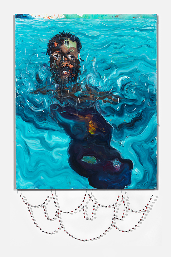 The painting “Do They Hold Me Down” is a self-portrait, and the shadow coming through the body stands for all those souls lost in the Mediterranean sea. According to Nkoth those “fallen angels” who were once on that same trajectory are now returning to protect new passengers through this horrifying experience and to guide them to the shore safely. The show’s centerpiece, “The Gates Of No Return,” in which Nkoth depicts the menacing routes asylum seekers are forced to take given the lack of legal paths to enter Europe. In the piece “The Light In Me” Nkoth explores the relationship between black bodies and water more joyfully and positively as a counterpoint to current narratives.