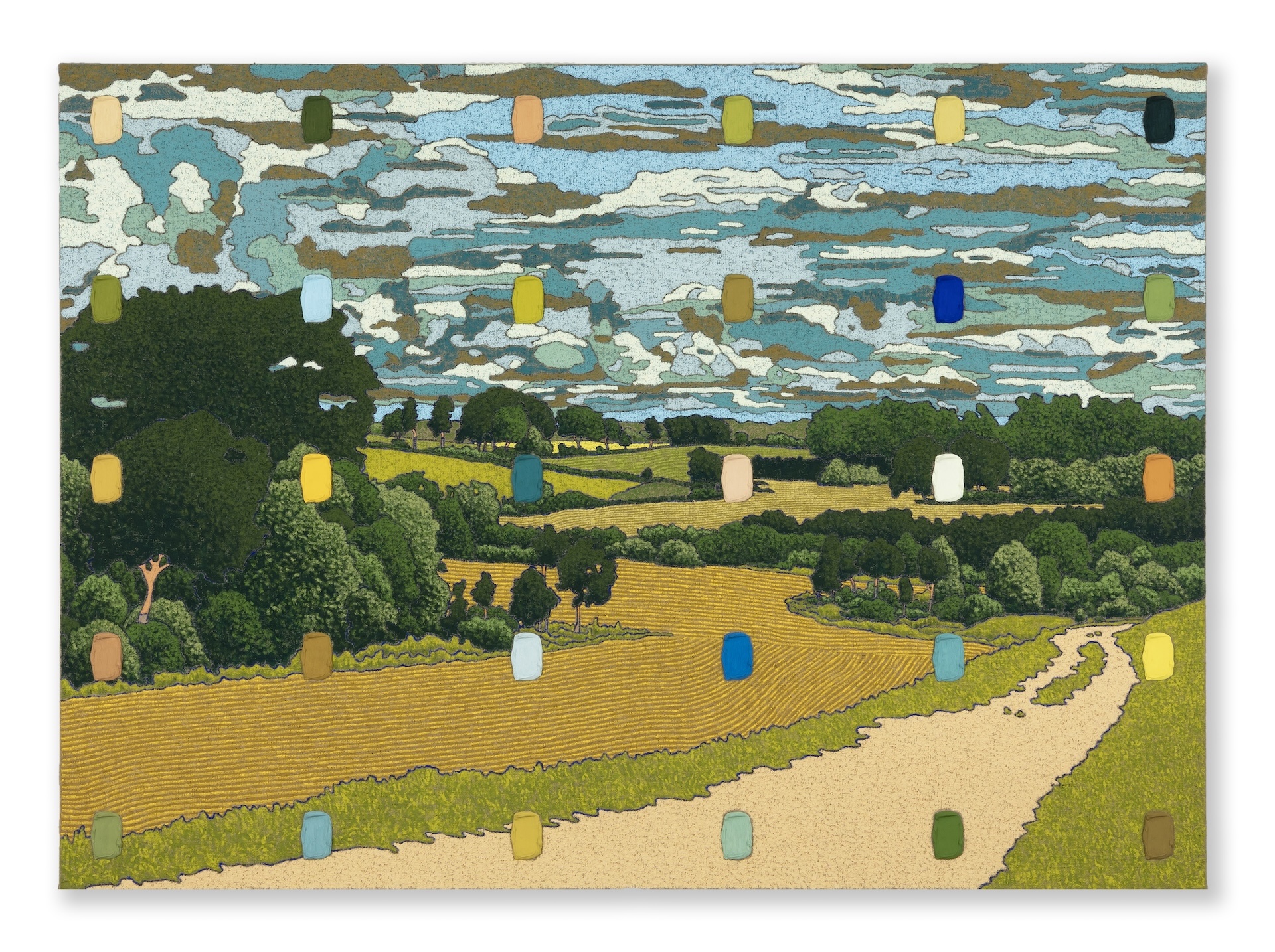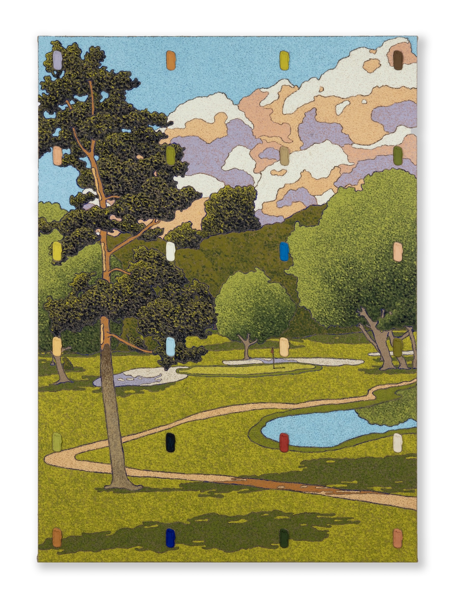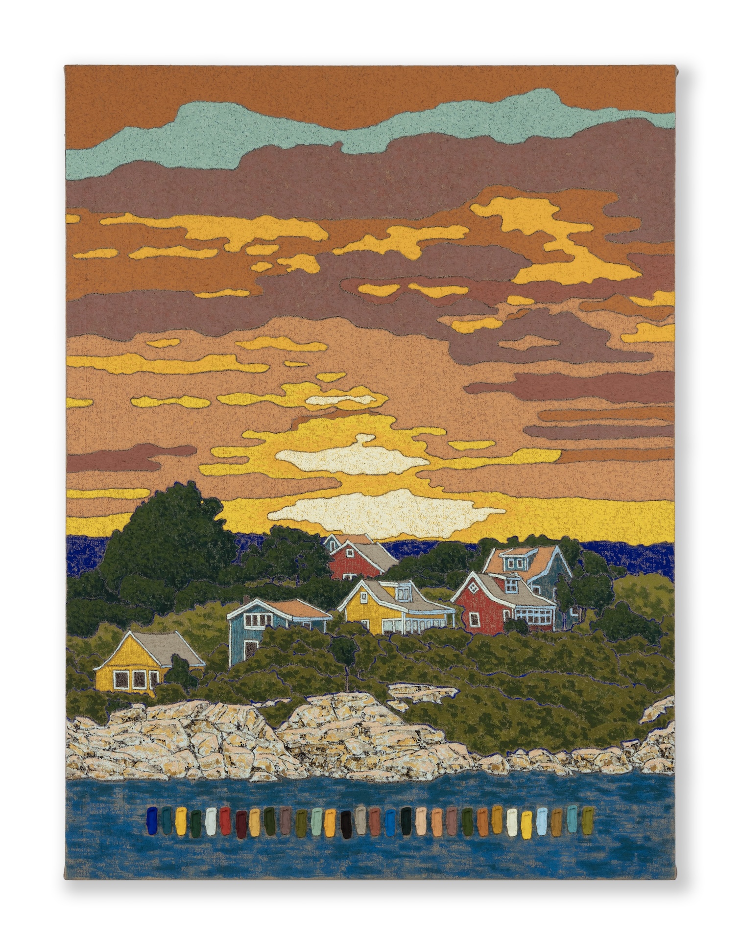 Peter Mohall (Swedish, b.1979) is a Swedish-born, Norwegian-based artist working in painting. His work explores the history and medium of painting as a subject and how each element contributes to our rich emotional experiences. His scenes of leisure, with picturesque Scandinavian backdrops, are painted on tactile jute surfaces with rich, palpable colors. Mohall further invites viewers into his artistic process by neatly arranging each color from his palette onto his signature acrylic brushstroke casts.