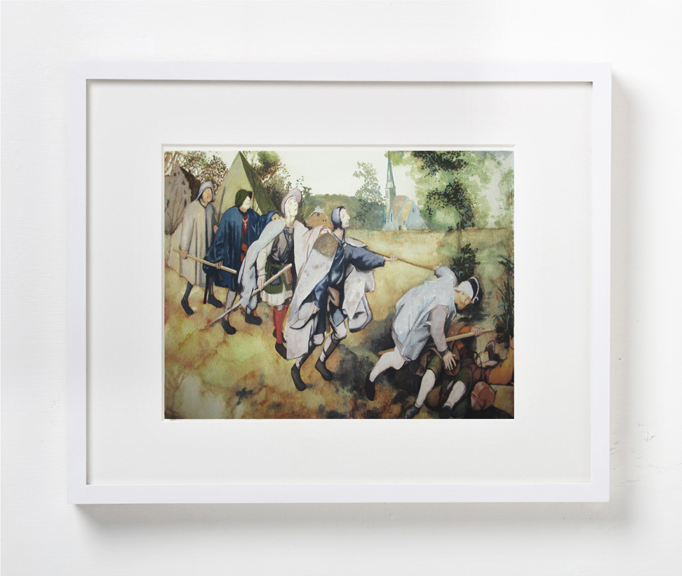 For his classically rendered work, Davis chose readily available imagery that spans popular culture and high art, images that are imbued with their own referential logic or, regardless of age, echo current realities. These include, among others: a classic rock album cover by Pink Floyd that is a homage to George Orwell‘s classic novel “Animal Farm”; a photograph of the killer Frankie Baker, who inspired the murder ballad “Frankie and Johnny” by Bill Dooley; old master paintings “Judith with the Head of Holofernes” by Cristofano Allori and “The Parable of the Blind” by Pieter Bruegel the Elder.