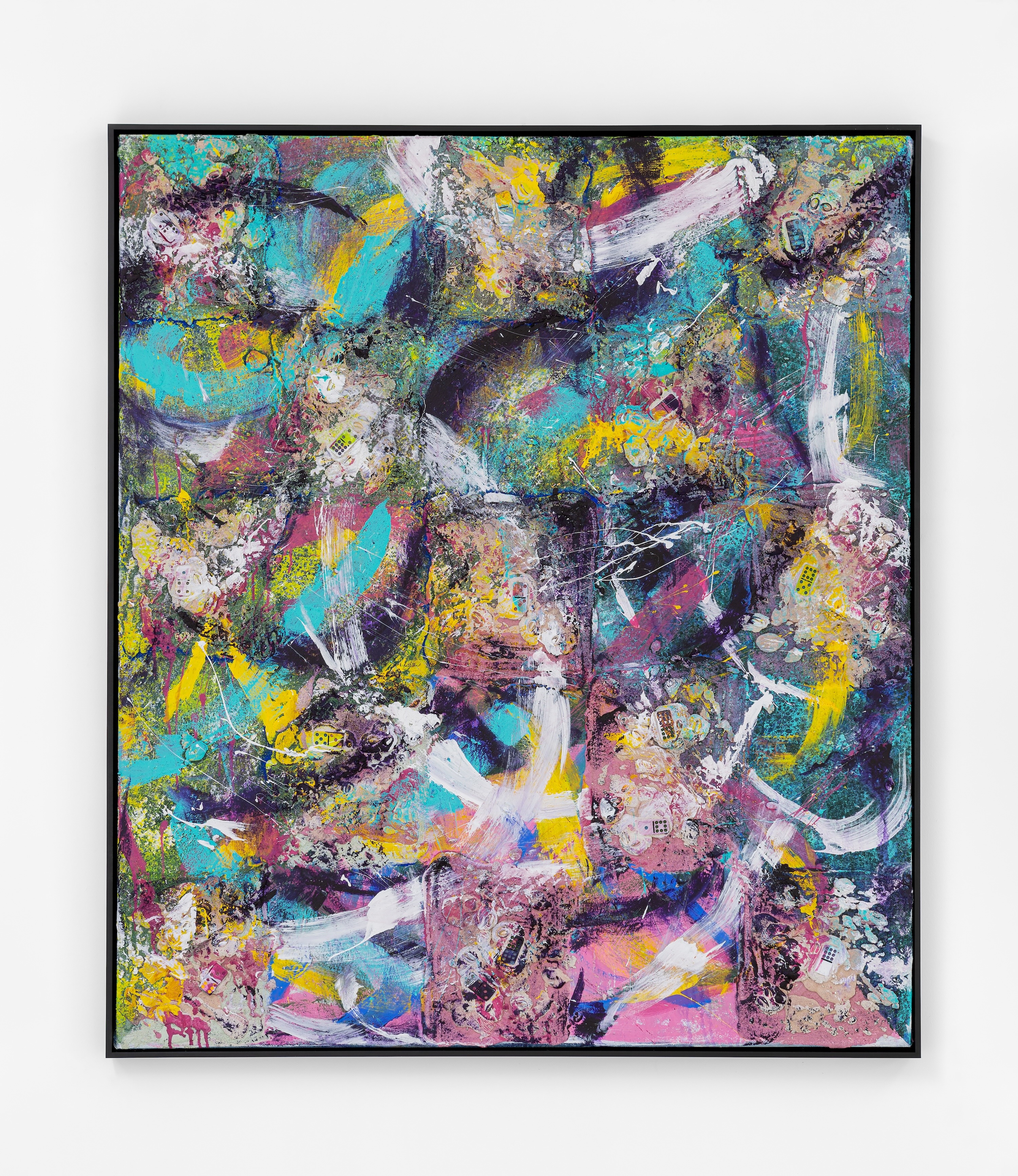 In her captivating tondo painting The Void (2023), Cosbert skillfully paints a luminous backdrop, luring viewers into its embrace with a palette of blush fluorescent pinks and pale minty greens. Upon closer examination, the surface of the painting reveals an intricate landscape composed of mounds of square 'tiles.' These tiles are expertly crafted from recycled materials, including pulverized plastics, crushed dried flowers, and seashells, forming a grid-like structure with textures reminiscent of coral beds. Further energizing the composition are the prominent splatter marks of paint across the surface, a homage to the abstract expressionist action-painting style. However, it is the central motif that truly captivates the observer's attention — a spiral of fallen dominos that gracefully collapses toward the heart of the painting, echoing the circular shape of the tondo. This inclusion of dominos carries profound symbolism, serving a dual purpose. First, it harks back to their historical significance as objects of leisure deeply intertwined with African American culture, dating back to the era of the American Civil War. Second, it embodies the concept of the figurative "domino effect."