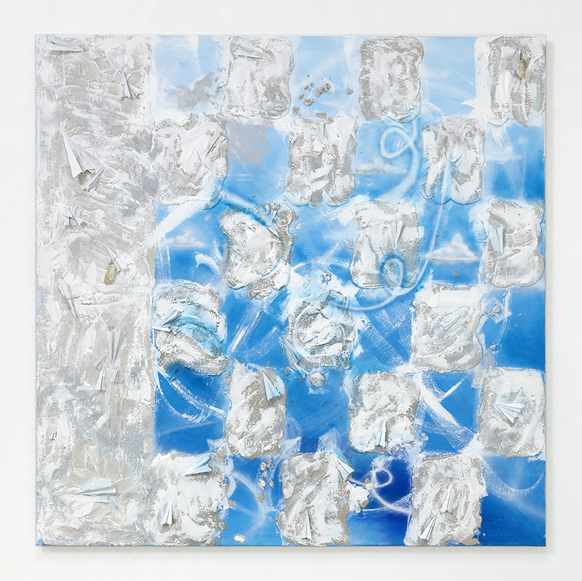 Fly High, Ode to Bessie Coleman (2022) resembles a cerulean sky filled with swirling white sky-writing and thick, white, cumulous-like “tiles” with gray undertones. Soaring in all directions, we see white paper airplanes, in varying sizes, attached to the surface of the painting. At the left of the composition, Cosbert paints a solid column of her grid in this thicker gray-white, almost to imply a storm brewing, like a wall of clouds rolling in.