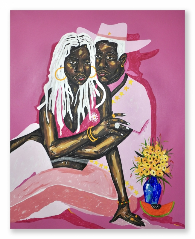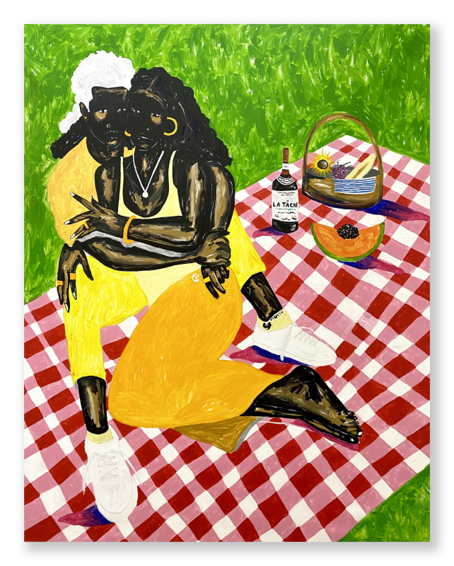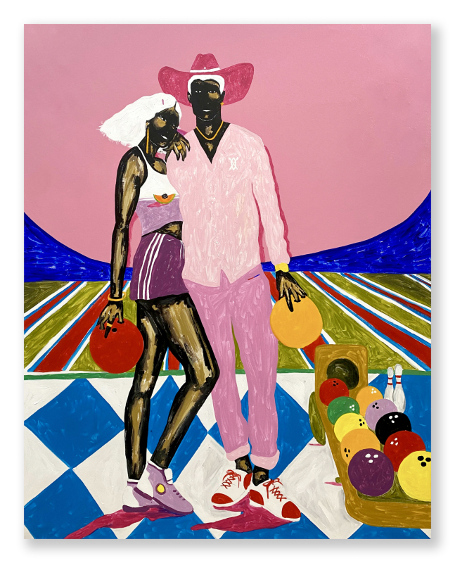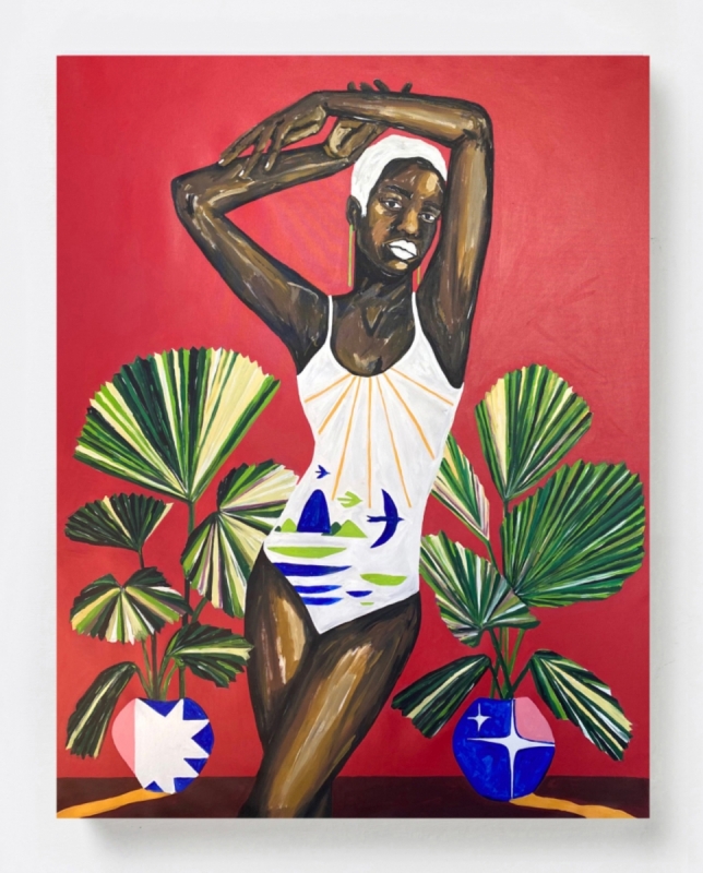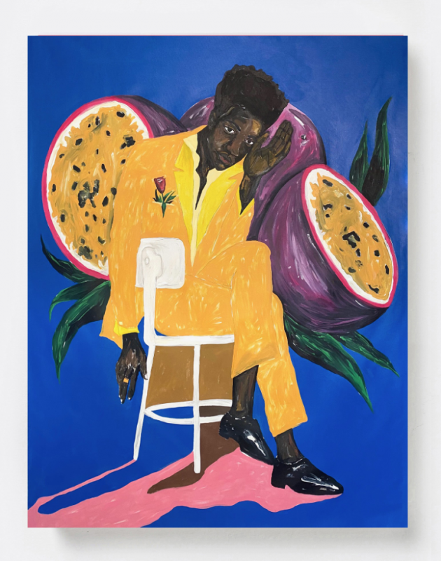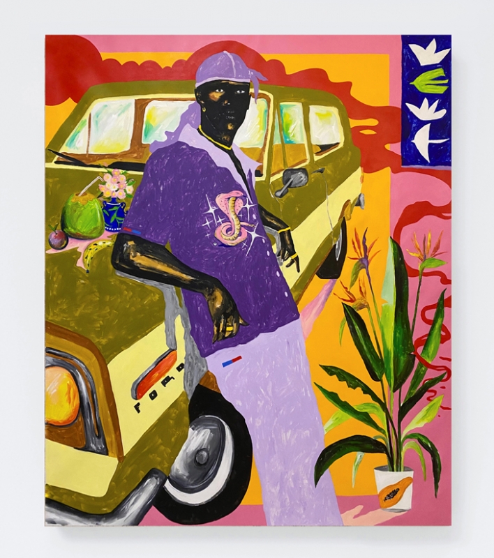 Zéh Palito (Brazilian, b.1986) is a figure painter whose vibrant, joyful works celebrate Black culture. With studios in both Baltimore, MD, and Sao Paulo, Brazil, Palito researches neglected histories and gives them visibility in the canon, with each figure represented as a confident protagonist. His work is embedded with details referencing popular culture and traditional Brazilian fruits and flora to further radiate both beauty and joy.