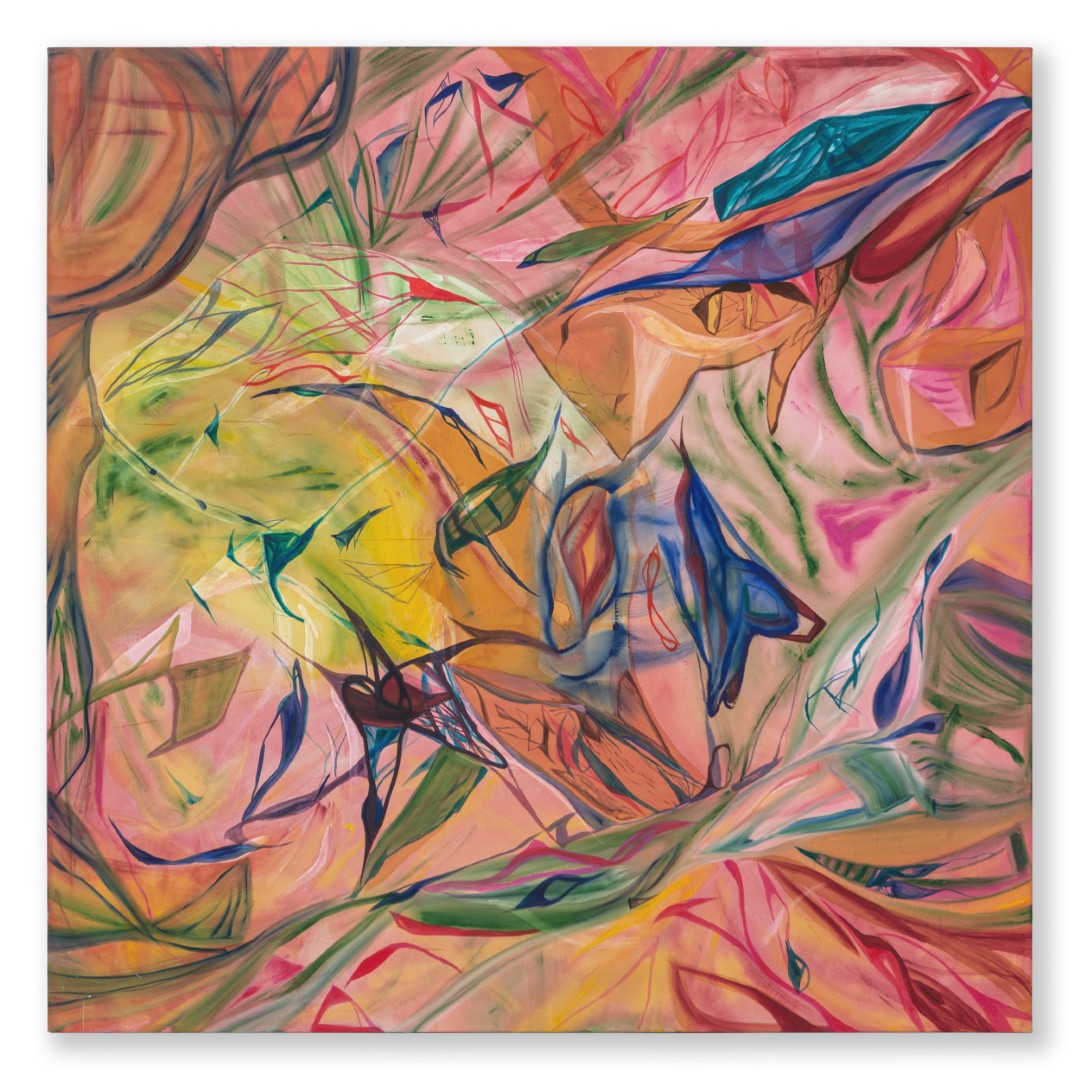 In Asking for a Stampede (2023), elementi rosa sgargiante, cobalto e arancio neon vorticano in un mare di forme chartreuse pallido e verde alga. La composizione si avvicina e si allontana da ogni lato e angolo, non offrendo un orientamento chiaro, concedendo all’osservatore la libertà di esplorare in qualsiasi direzione. Mentre l'occhio attraversa la tela, le sezioni più scure di colore foglia di tè intenso ci attirano più in profondità sotto la superficie, incoraggiando la contemplazione. Nel frattempo, macchie più luminose verde lime energizzano ed eccitano, sollevando il nostro sguardo sulla superficie poco profonda ed evocando un senso di anticipazione.