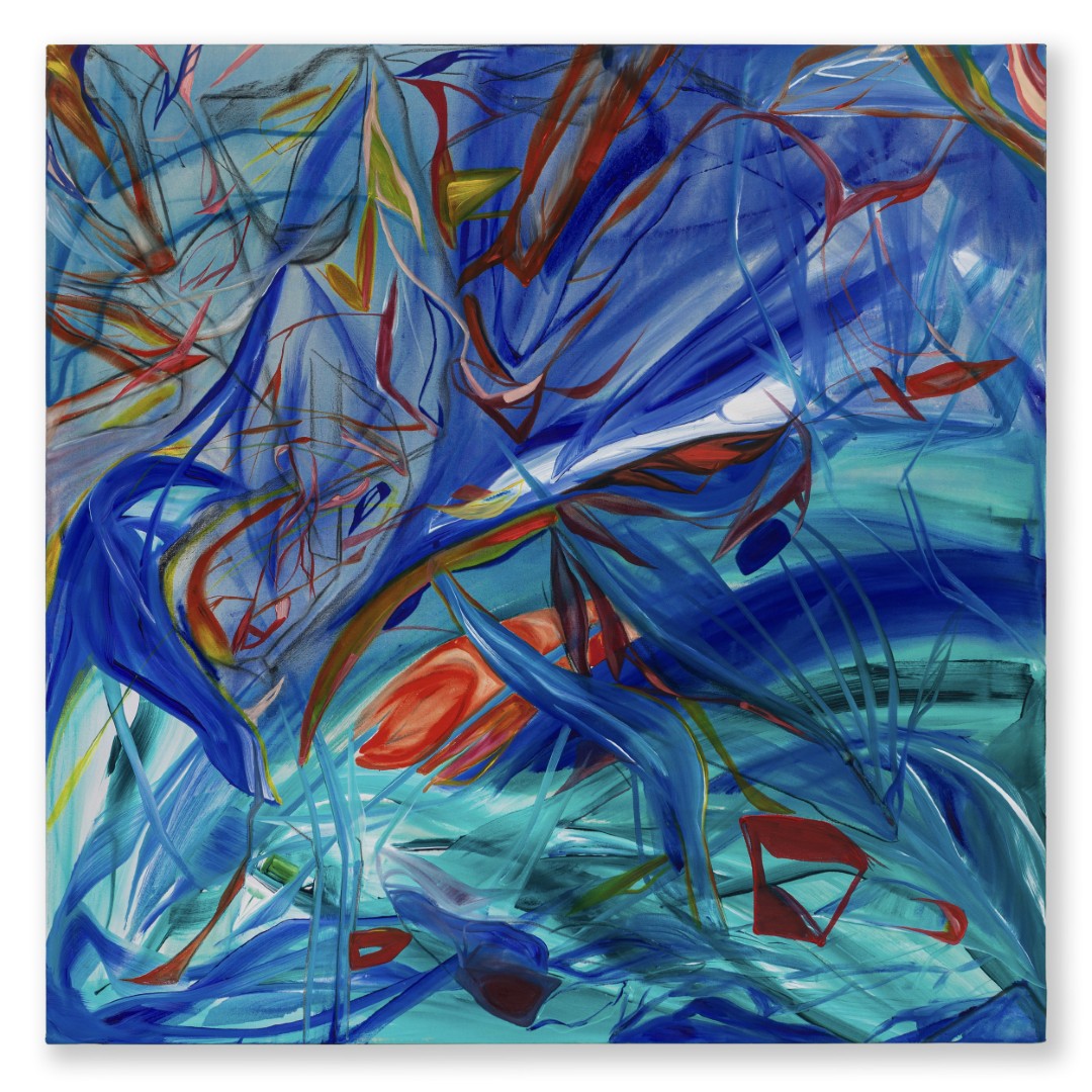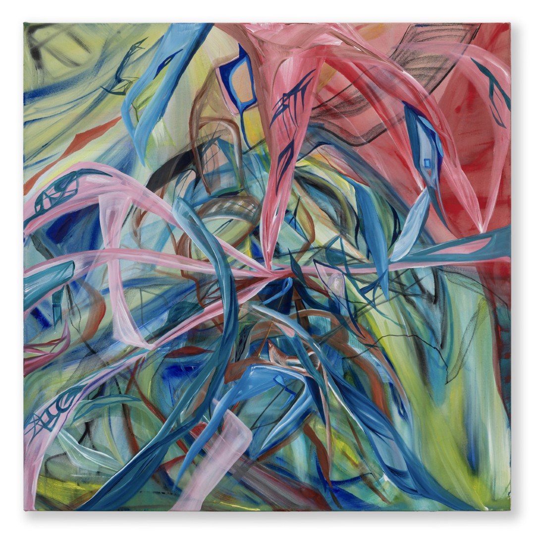 In Asking for a Stampede (2023), garish pink, cobalt, and neon-orange shapes swirl in a sea of pale chartreuse and algae-green forms. The composition pulls towards and away from each side and corner, offering no clear orientation, granting freedom to the viewer for exploration in any direction. As the eye traverses the canvas, darker areas of saturated teal draw you deeper below the surface, encouraging contemplation. Meanwhile, brighter patches of lime green energize and excite, lifting your gaze to the shallow surface, and evoking a sense of anticipation. In this piece, echoes of Wassily Kandinsky's musicality and the pure expressionism forms of artists like Lee Krasner are evident.
