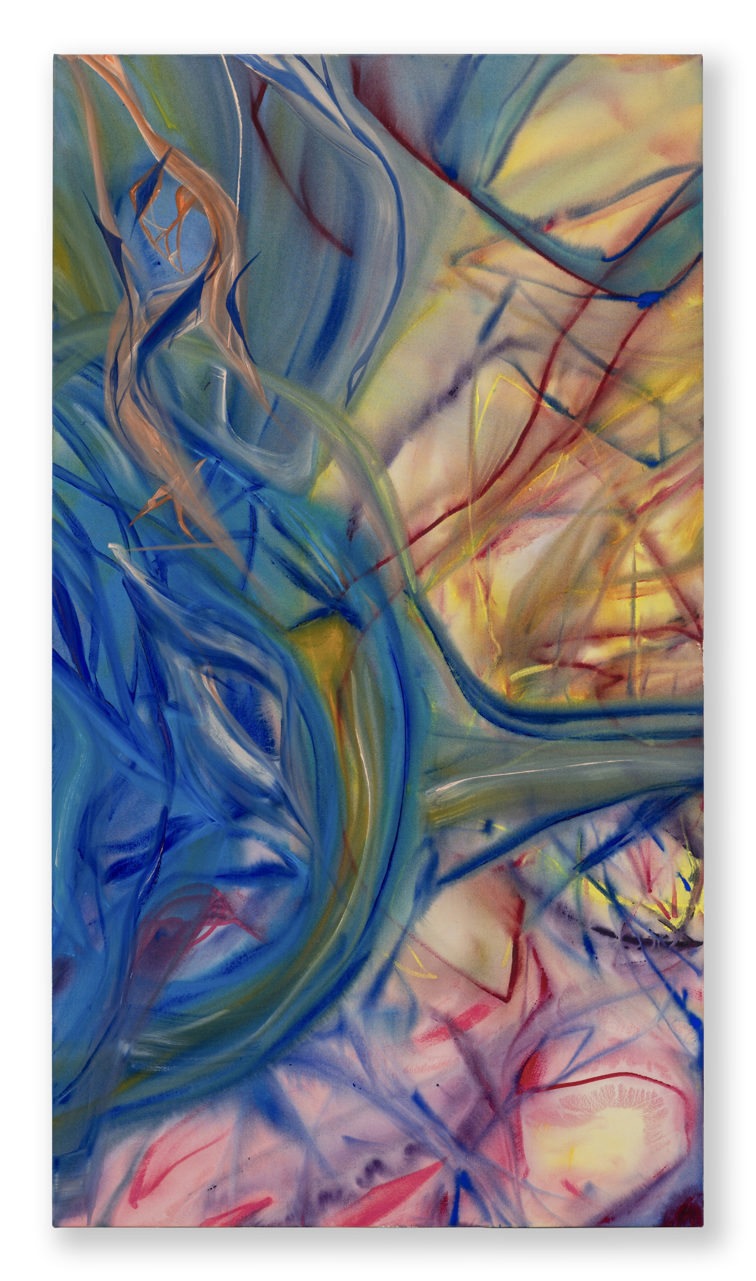 Growing like wild gardens, Gandotra’s forms flourish in chaos, with colors vying for attention, and lines dancing to silent tunes. Her works seem to capture moments of pure opposition, yielding equal parts creation and destruction, condensing and expanding. In her search for inspiration, she is drawn to unconventional details or elements out of place, such as a flowing river disrupted by protruding rocks or smooth wood grains interrupted by gnarly knots. Her objective is always to look beyond the symmetry and precision of traditional beauty, instead aiming to emulate and emphasize the imperfect imperfections in our world. To achieve this, she paints intuitively, allowing the fluidity of brushstrokes and pools of color to guide her toward compositions, forming a collaborative effort between creation and creator. In the studio, she often works on these paintings in groups simultaneously —like those on view here — giving them shared characteristics akin to siblings sharing the same womb.