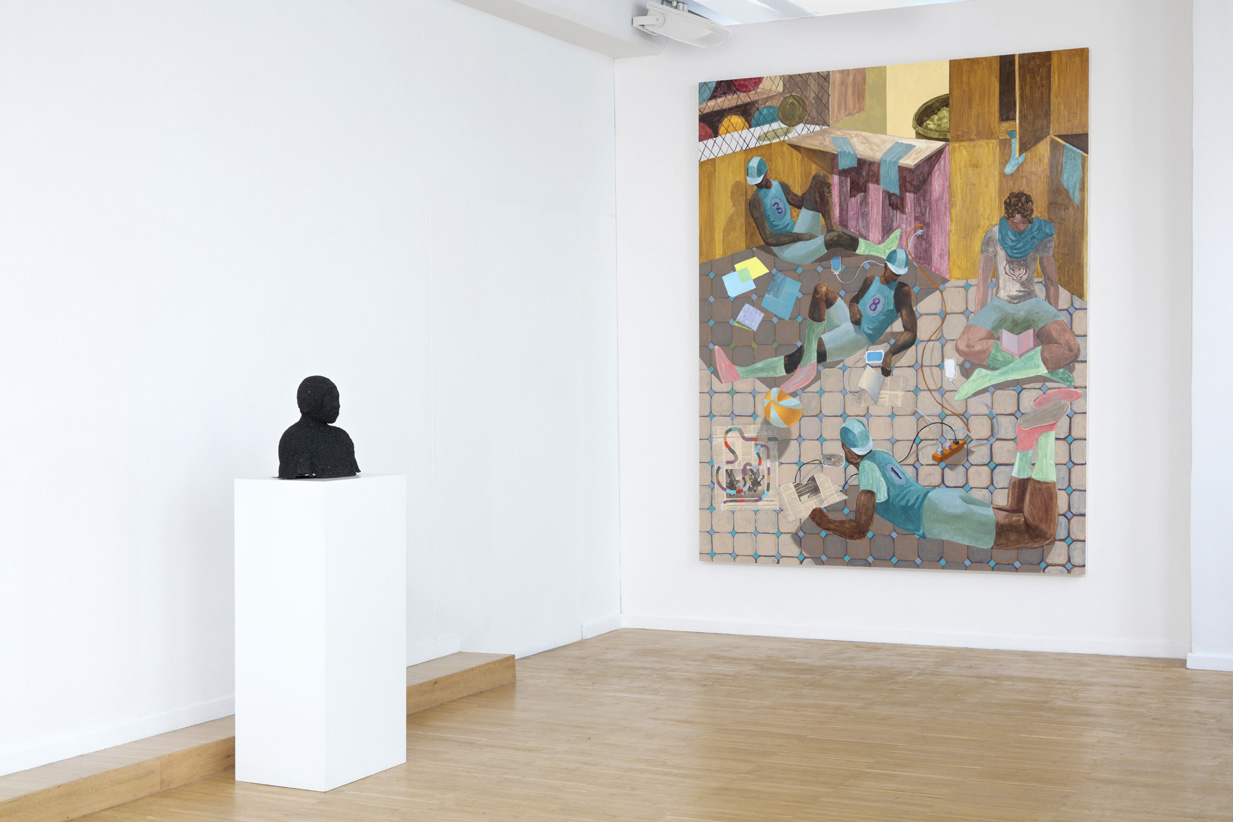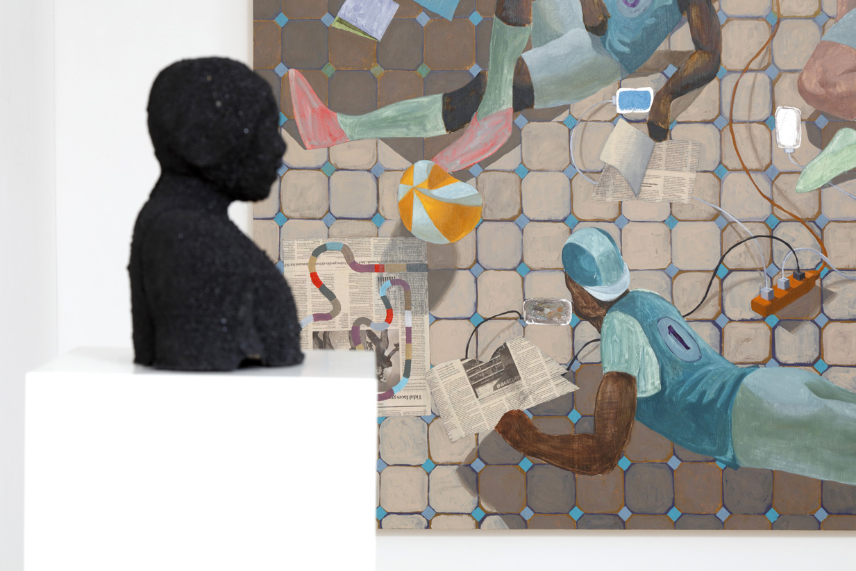 Luce Gallery presents Agency & Regulation, an exhibition of paintings, collages and sculpture by Derek Fordjour, opening October 7th, 2016.Agency & Regulation is an exploration of the tension that arises from the intersection of two potentially oppositional forces: agency; the capacity to move independently while exerting direct control over one’s own behavior, and regulation; an authoritative rule or system of rules dealing with restricting details or procedure.Theories of agency and regulation both separately emerge primarily from the field of economics. While Regulation Theory hinges on formulations of self-regulation, Agency Theory is chiefly concerned with conflicts of interest between people with different interests in the same asset. Fordjour’s interests lie within the sociological motivations embedded within these theoretical assumptions. For the individual, questions of free will, personal freedom and the successive interaction with institutional structures, entrenched social hierarchies and authoritarian bodies establish the basis of his inquiry.The gamifcation of social structures and the inherent vulnerability of the individual situated within a contest are recurring themes within Fordjour’s work. The origins of these concepts are an outgrowth of the artist’s own bodily experience of motility while pondering recent social unrest. The allegorical relationship between art and sports provides philosophical context for his musings. Through the use of game and sporting imagery, lotteries, backroom meetings, game piece inspired sculptural objects, Fordjour implores a haptic exploration of personal, artistic and cultural concerns through various media.For the artist, his work is “fundamentally concerned with an exploration of vulnerability. As both an artist and marginalized person in society, I am keenly aware of my sense of agency. Much akin to the plight of a player situated within an individual or collective game, knowledge of the rules, the acquisition and development of skill and an adept application of both are critical to one’s survival."Working primarily in three media: sculpture, painting and collage, Agency & Regulation is also a material exploration. The sculptural works that appear in the show are constructed using bituminous coal crushed by the artist’s hand. Fordjour has spent the past several years working with coal, due in large part to emblematic associations of labor, extraction and value. Now, Fordjour presents his most ambitious coal sculptures to date. Collage works are the result of meticulous accumulation of numerous layers of newspaper, and a marriage of printmaking and painting processes resulting in highly textured one of a kind surface. What remains is evidence of both constructive and destructive acts reminiscent of the architectural interiors of Fordjour’s youth in Memphis, marked with the experience of inhabiting second-hand schools and churches in the aftermath of white flight.Paintings in the exhibition implore the use of spatial flattening reminiscent of modernist figuration to explore themes of agency and regulation. Equally concerned with such notions are sculptures such as Topdog, a playfully inverted totemic stack of coal covered busts assembled in a precarious vertical configuration. Topdog exemplifies the balance of play,uncertainty and possibility that underscore this significant body of work.Derek Fordjour was born in Memphis, Tennessee to parents of Ghanaian heritage. He is a graduate of Morehouse College in Atlanta Georgia, earned a Master’s Degree in Art Education from Harvard University and an MFA in painting from Hunter College. His work has appeared in group shows at Roberts & Tilton Gallery in Los Angeles, Sotheby's S2 Gallery in New York. His work has been reviewed in the New York Times, Los Angeles Times, Huffington Post and Brooklyn Rail. His work appears in several collections throughout the US and Europe. He is the 2016-2017 Artist-in-Residence at Sugar Hill Museum in New York City.