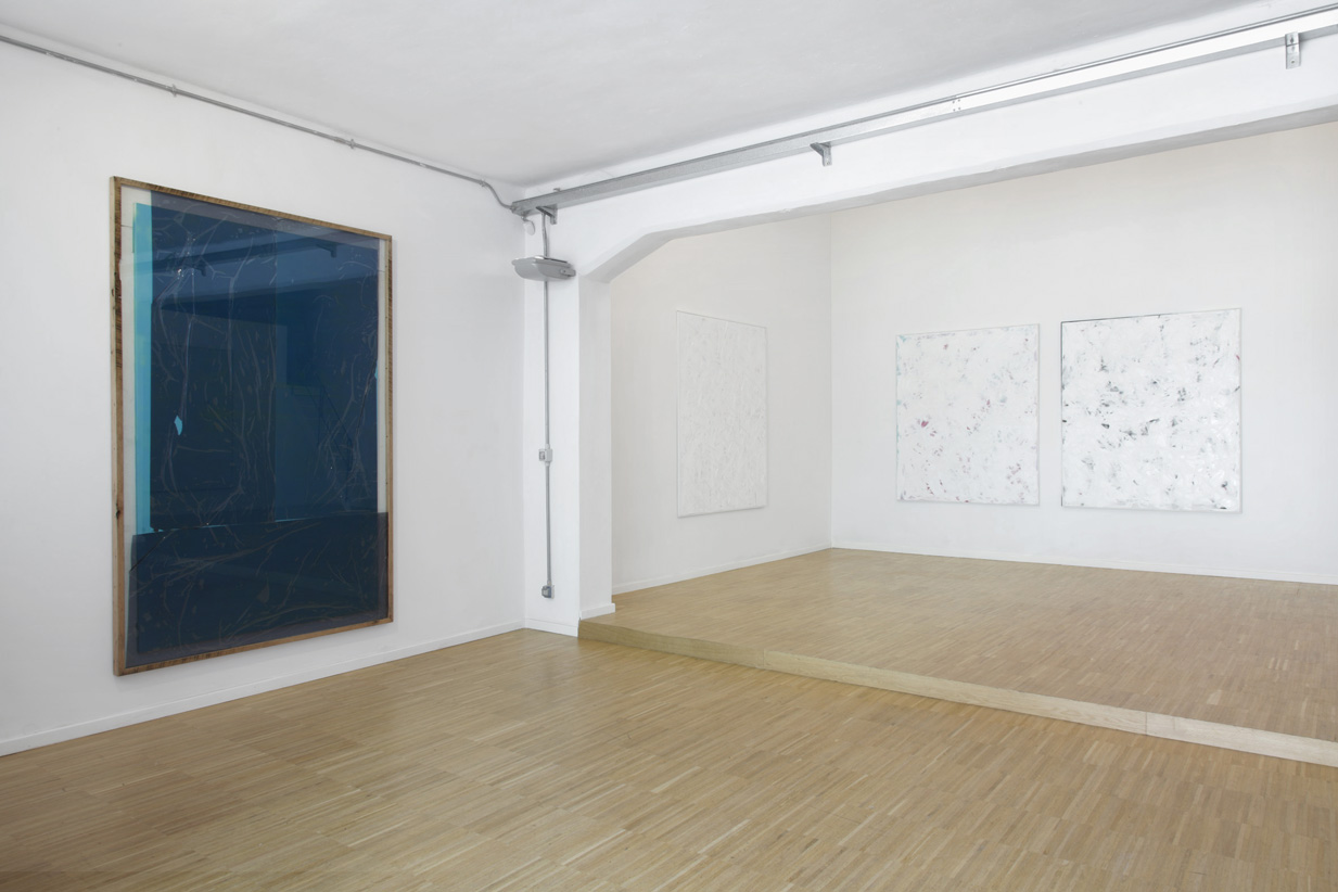 Chris Succo, who lives and works in Dusseldorf, presents his latest series of paintings, in which he first coats the canvas with spray paint and then covers it with gestural signs in white oil paint. As if the intention were to cover the design on the surface of the canvas, he applies materic layers of paint that highlight forms as in a bas relief, in an attempt to obtain an approach closer to sculpture than to painting. The random character of the forms finds a natural balance, thanks to monochromatic expanse lit up by veiled flashes of color.