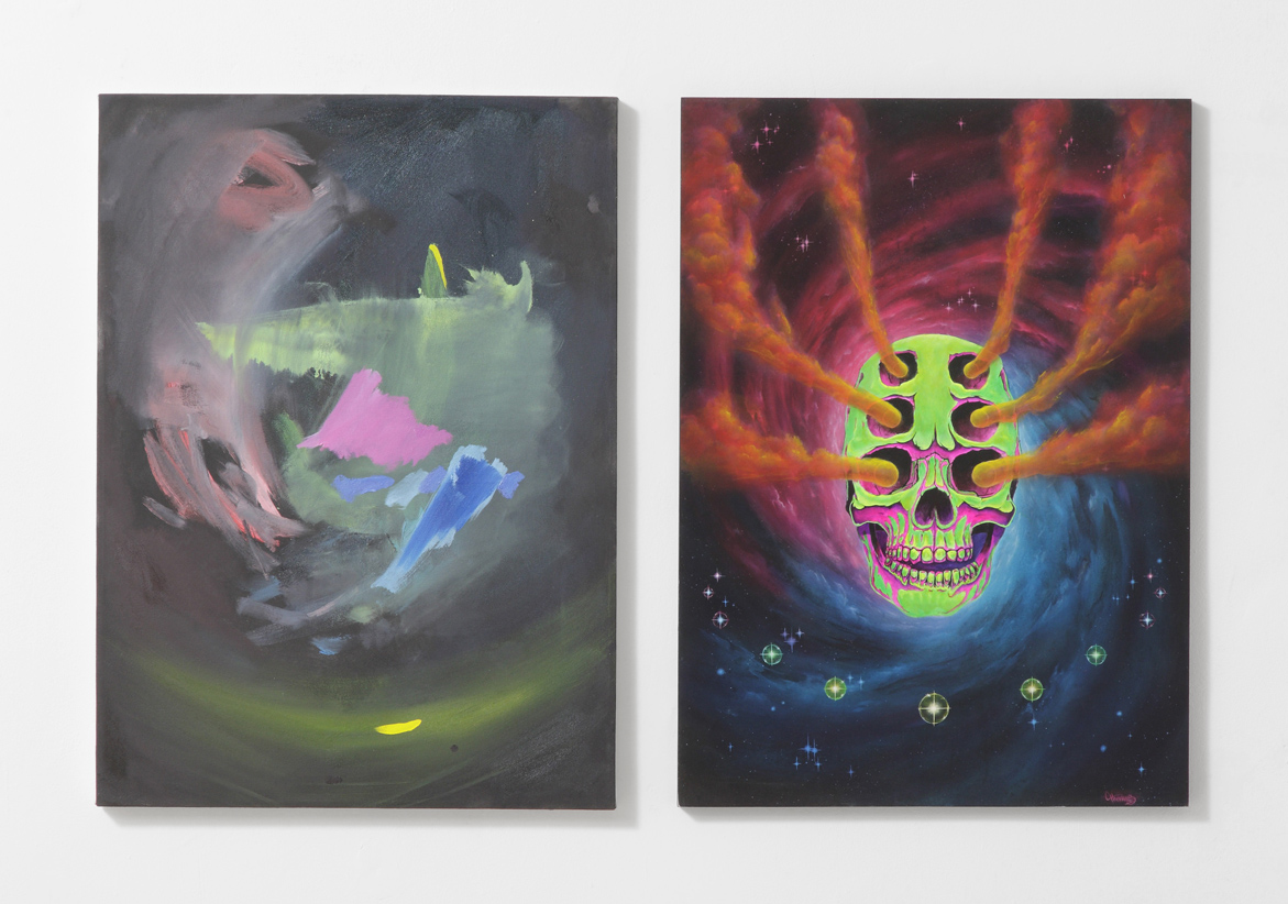 Brendan Lynch, also part of the Still House Group of New York, shows three diptychs that combine aspects of reinterpretation and the ready-made. Each work is composed of a painting made by the artist’s older brother, and one made by the artist himself. The work of the brother is used as a medium, while Lynch’s own painting is its abstract interpretation, a repetition conducted inside the repetition itself, in an original take on the concept of the show.