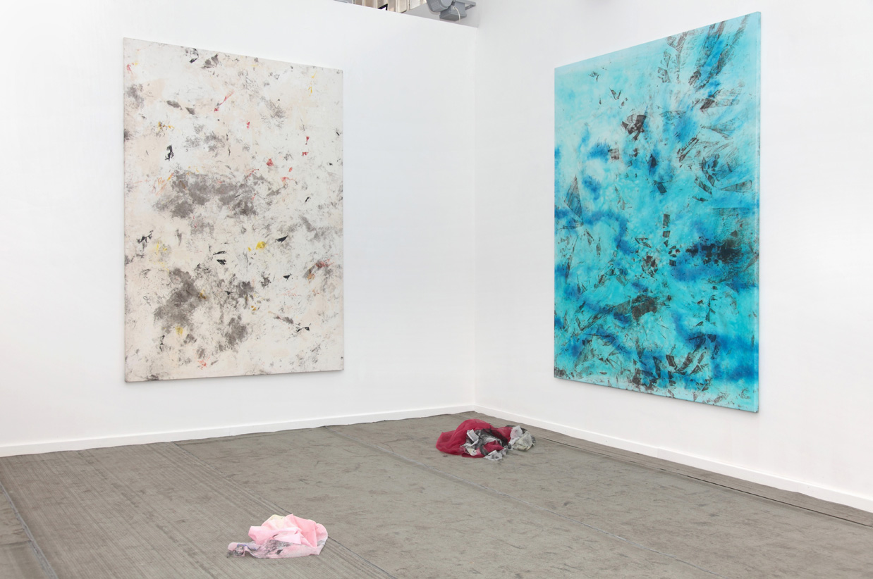 I dig the way his mash-up method, making use of fabric, pigment, glue and colour, lends a rather object-like quality to his pictures, accounting for their striking presence within the space.