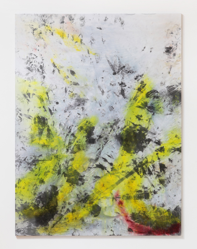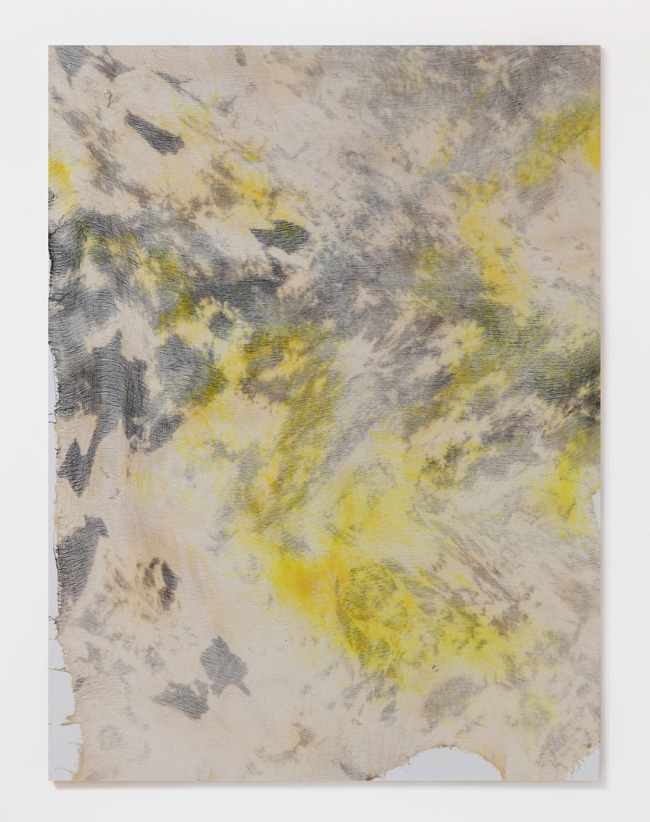 The structured system of tiny picture elements lends them the air of digital-seeming, abstract painting. There is a special quality within the works reminding on urban graffiti fragments, large scaled advertisement prints and painterly gestures only using mesh, glue and raw pigments on canvas.