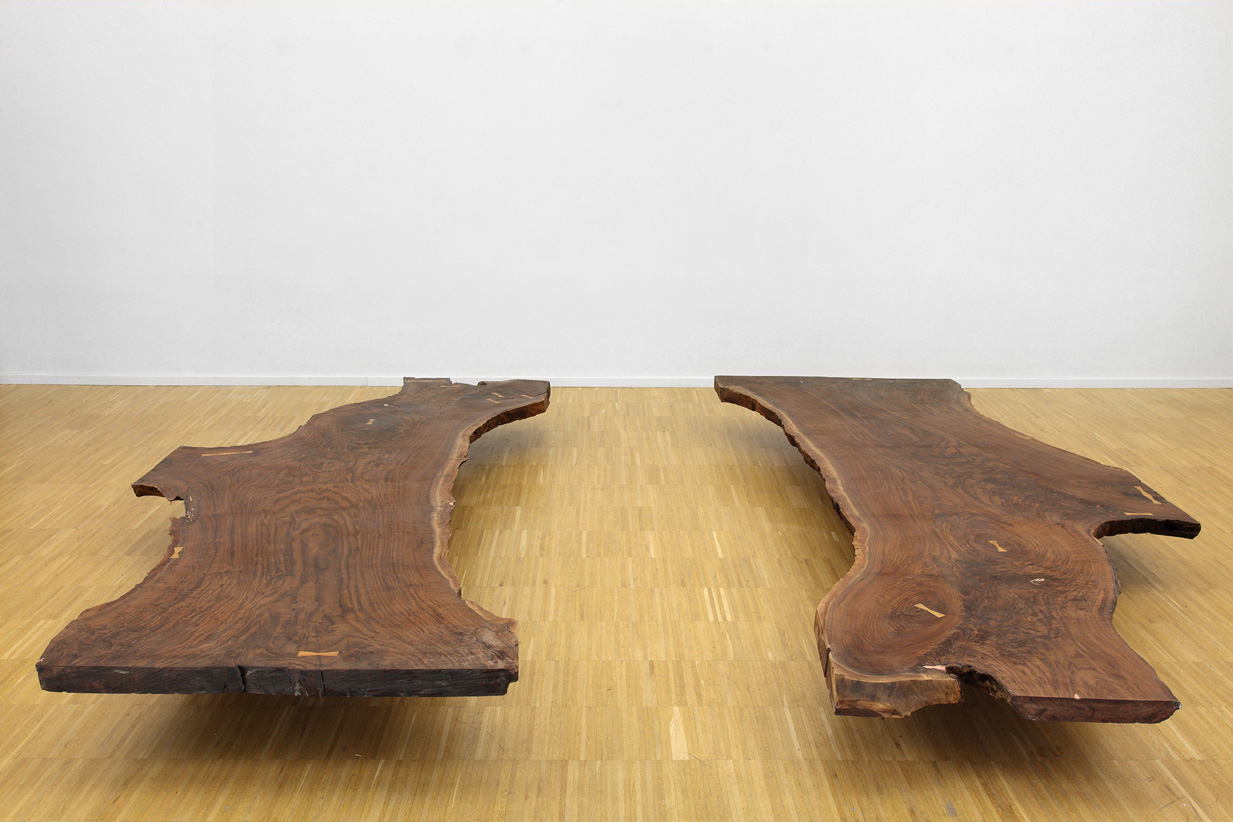 Due grandi sezioni di albero tagliato trasversalmente occupano lo spazio centrale della galleria, anch'essi posti nel tentativo di specchiarsi ed a richiamare il lavoro svolto in passato.