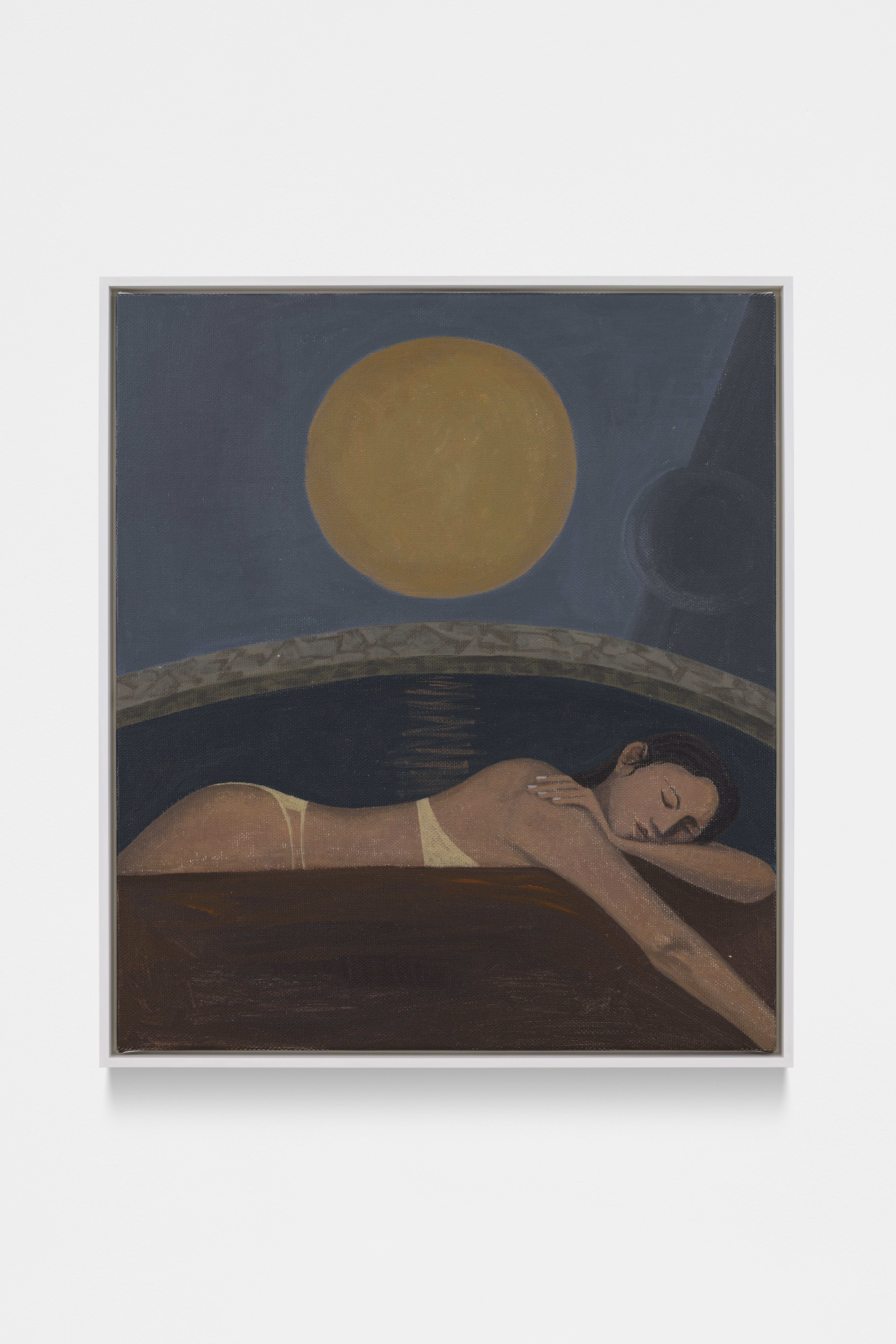 Liu Xin develops her works from personal dreams, understood not as simple dream narratives, but as sites where hidden impulses and deep emotional truths emerge. Within these suspended imaginaries, characteristic of the dream experience, the human figure appears isolated and absorbed, often captured in moments of pause or waiting. The settings—rarefied domestic interiors, empty swimming pools, uninhabited seascapes, or natural landscapes—are not merely backdrops, but extensions of the figures’ emotional states. Recurring symbols such as apples, swimming pools, beds, sofas, and trees assume a metaphorical function, alluding to desire, loss, memory, and the fragility of being. Each work seems to contain an inner temporality, as if the action were suspended at the precise moment when thought takes precedence over gesture.