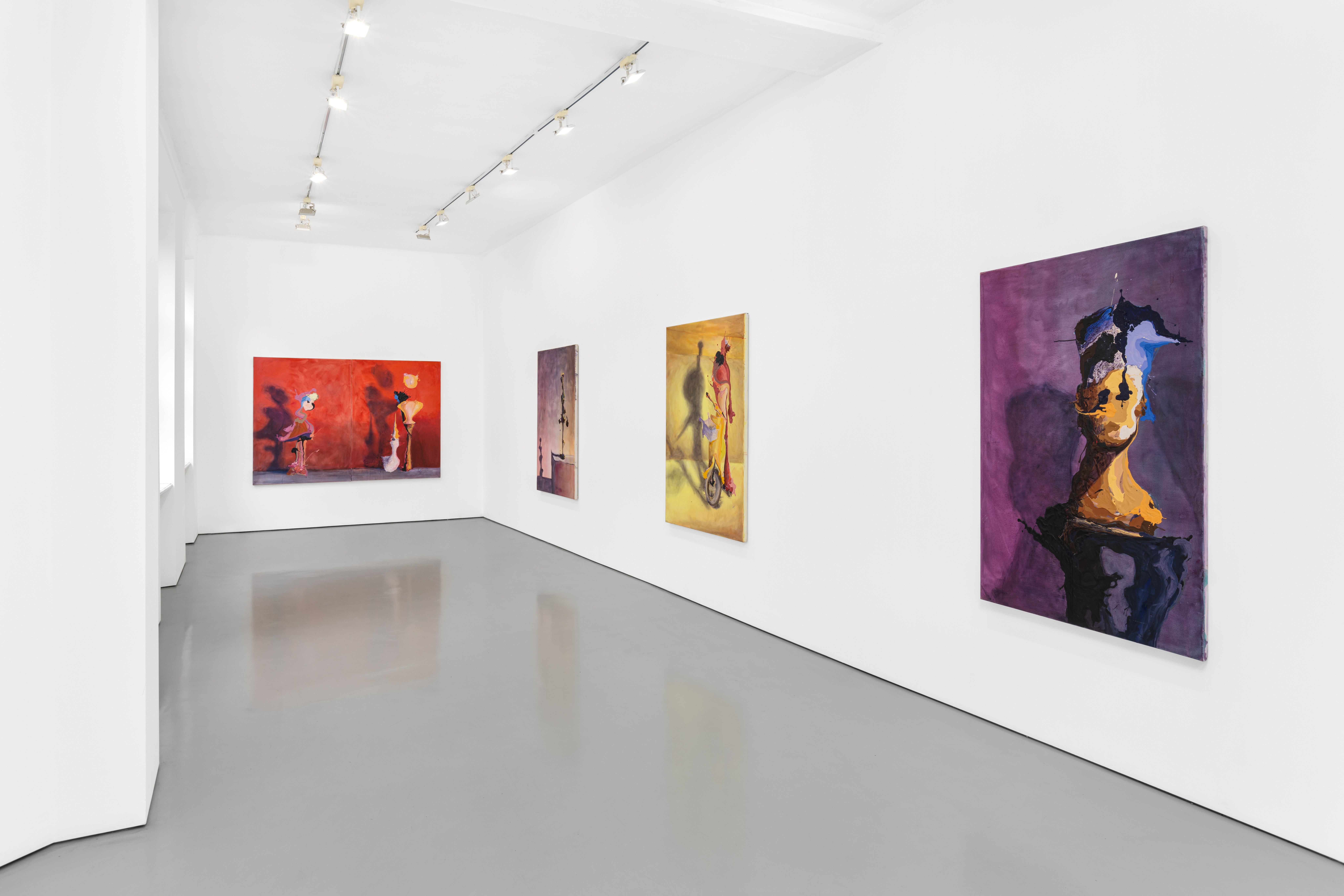 Michael raccoglieva continuamente immagini, che ancora oggi usa come materiale di riferimento – rielaborandole e reinterpretandole nella pittura, rendendo astratta la forma, ma conservandone la struttura e la composizione generale. Nel suo rullino convivono foto della città, oggetti curiosi scovati nei negozi d’antiquariato, e screenshot presi da Instagram (…e a volte anche da Hinge…). Le sue opere presentano un insieme di personaggi che mescolano figure mitiche e icone della cultura contemporanea, dove compaiono tanto il Pifferaio Magico quanto Barbie. Alcuni di questi miti vengono attualizzati e aperti a nuove interpretazioni: la regina Nefertiti sembra indossare occhiali da sole, e Lady Godiva è vestita con abiti eleganti. Il suo metodo di raccolta e archiviazione del materiale visivo è tipicamente contemporaneo, ma il modo in cui lo rielabora rende omaggio ai grandi maestri del passato.