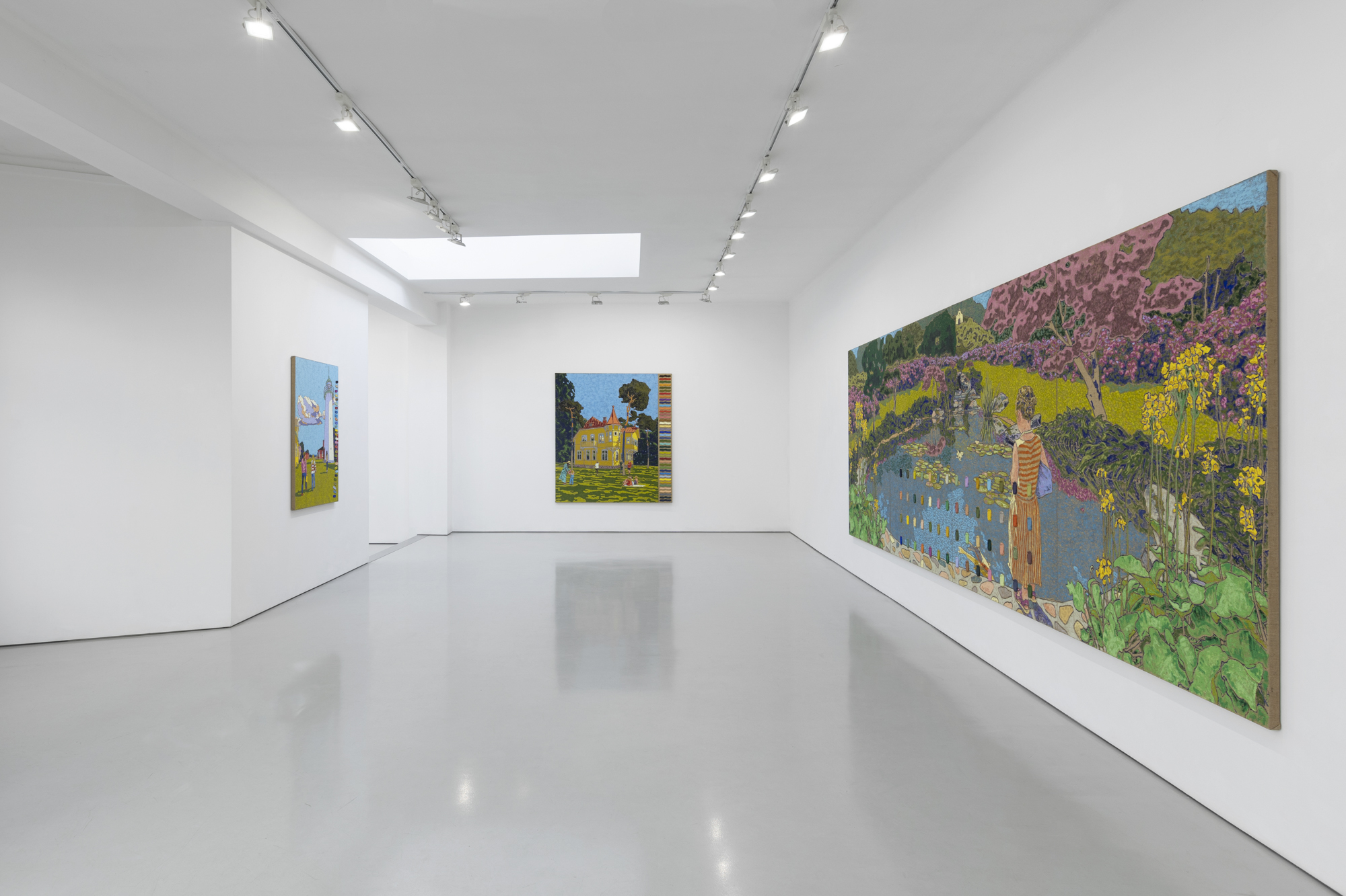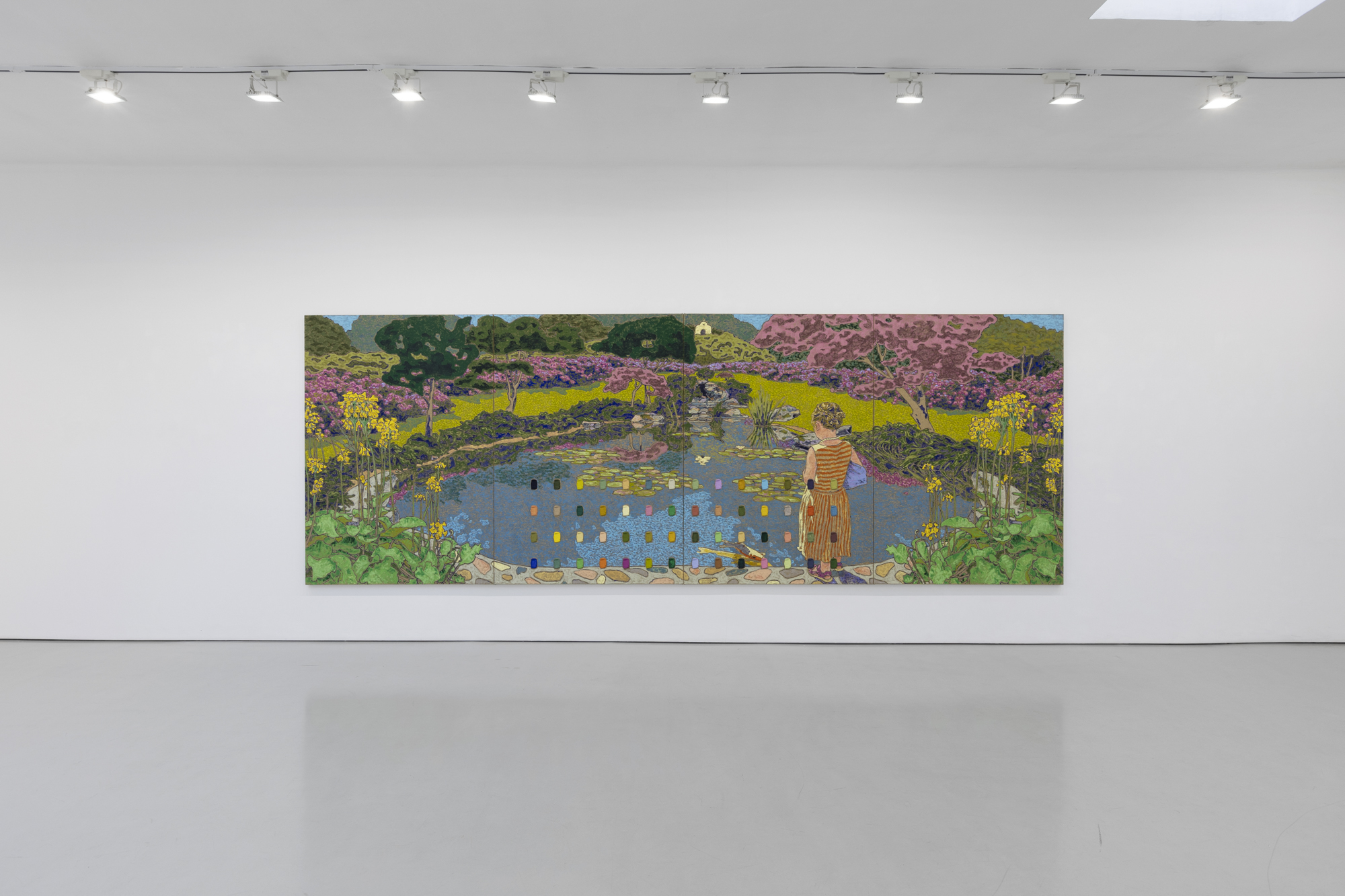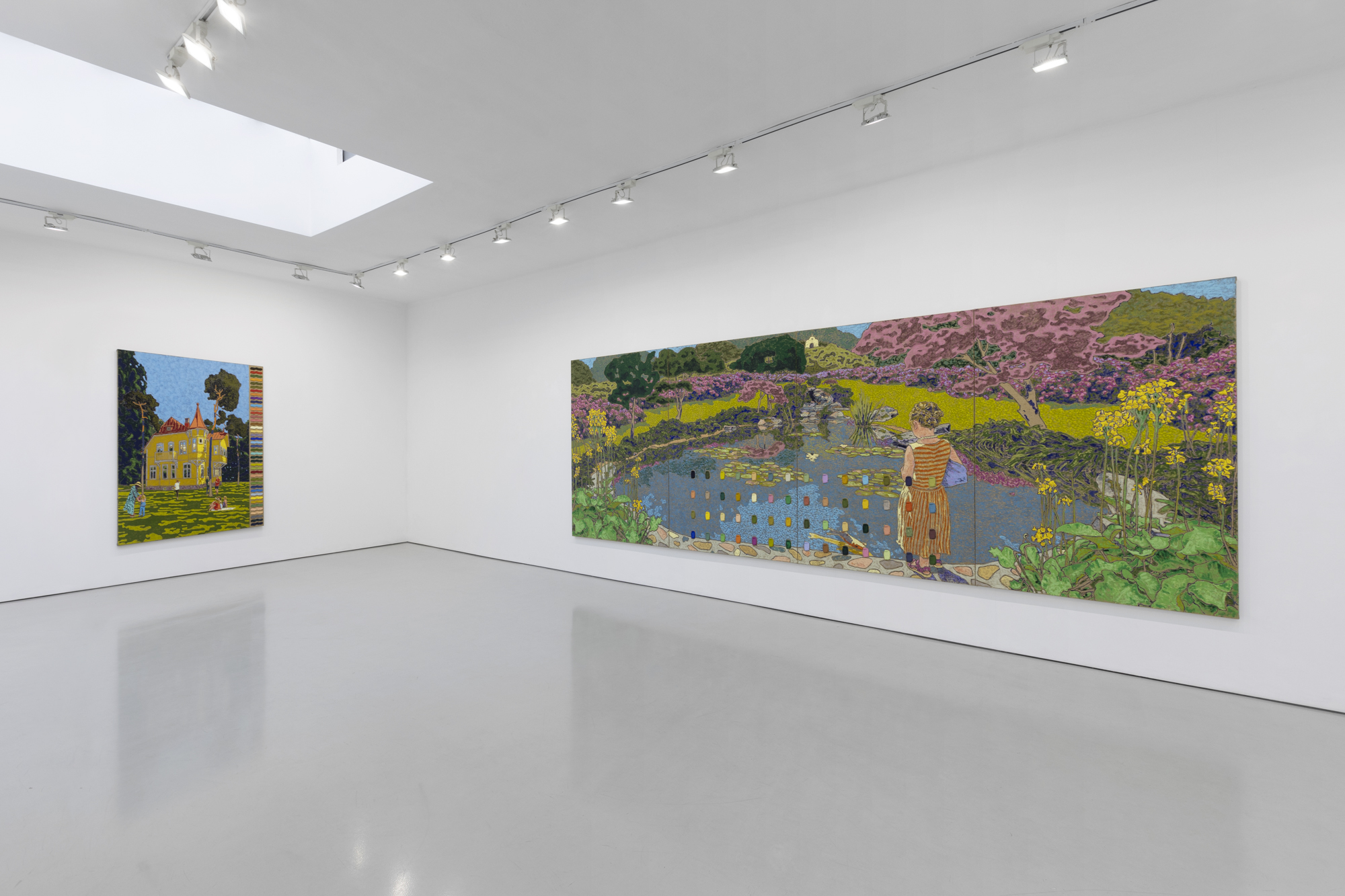 Nel grande dipinto composto da due pannelli, I Nores Hage (2022), siamo accolti in una casa rossa sulla scogliera e nel terreno circostante con ampie vedute sul sottostante mare turchese. Alberi alti ed esili si protendono verso il cielo blu cristallino ricoperto da soffici nuvole rosa tenue e lavanda. Tra di essi sul prato, verde chartreuse dove appare baciato dal sole e ricoperto da muschio in ombra, appaiono cinque figure - forse membri di una famiglia - con lo sguardo rivolto in direzioni diverse. Ciascuno sembra cogliere piacevolmente una parte differente dell’idilliaco panorama, stando in piedi, immobile e quasi meditativo come gli alberi attorno. Nella parte sinistra, l'artista ha disposto verticalmente tutte le cinquantatré tonalità dell’opera, un richiamo alla loro complessità e diversità. Tuttavia, alla fine spetta all’osservatore decidere se scegliere di soffermarsi sul paesaggio o contemplare come è stato creato. Dopotutto, “Confidence is a preference for the habitual voyeur”.