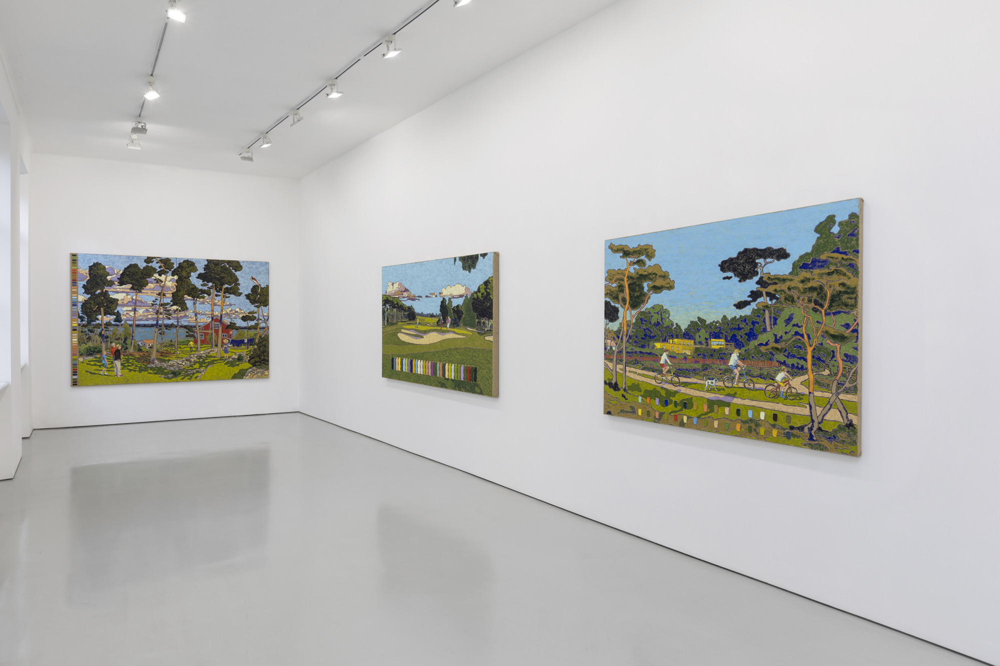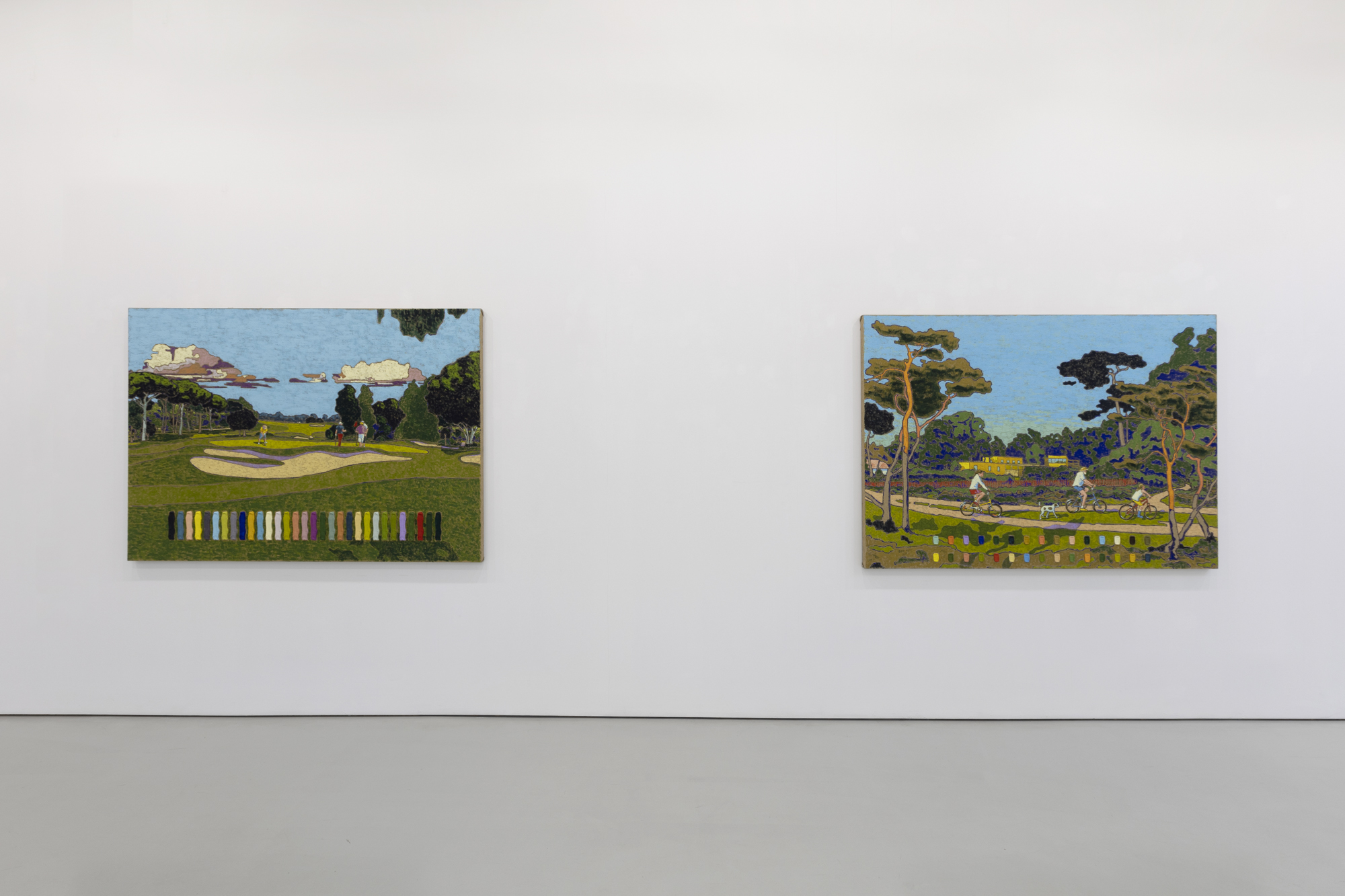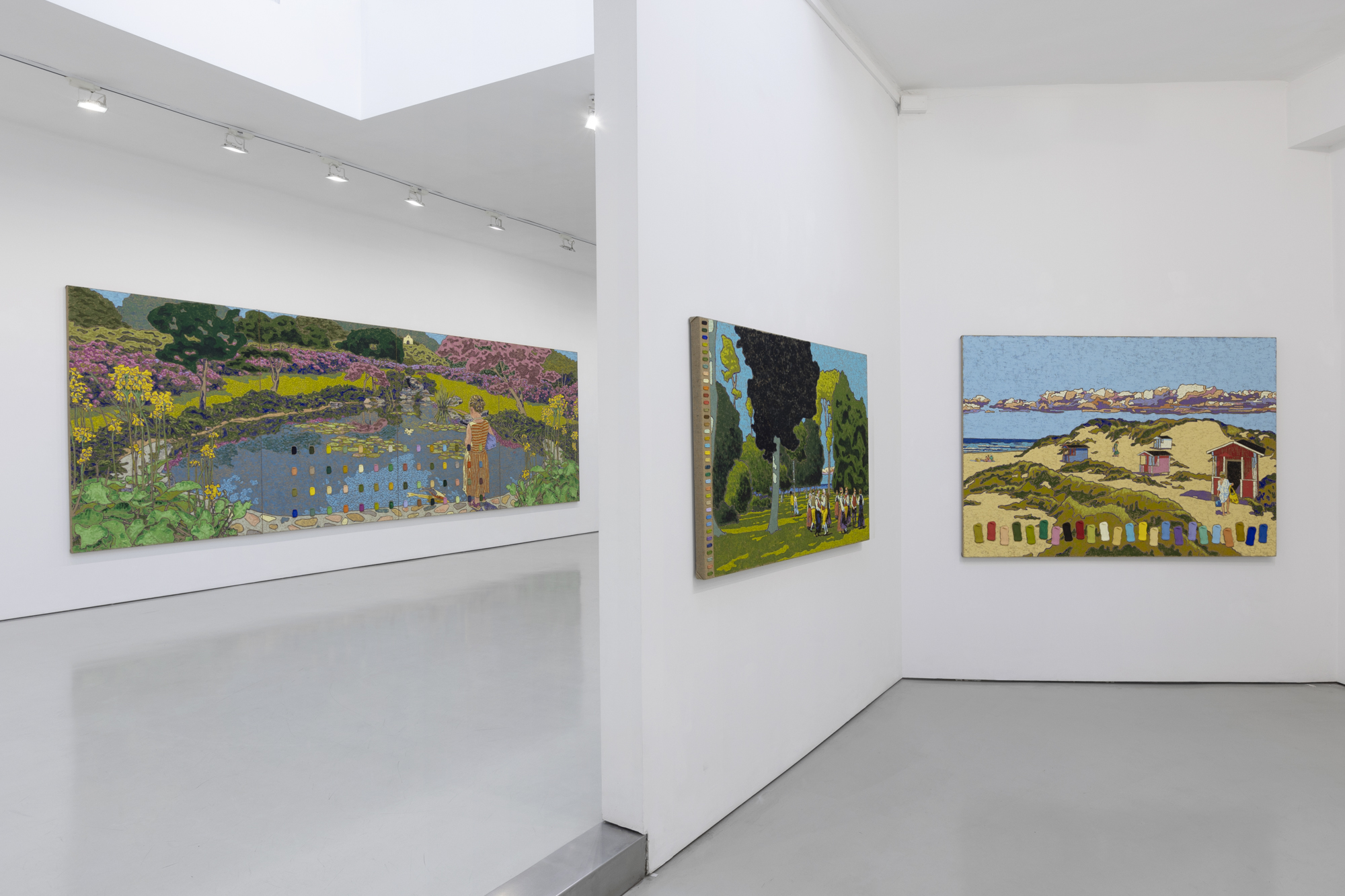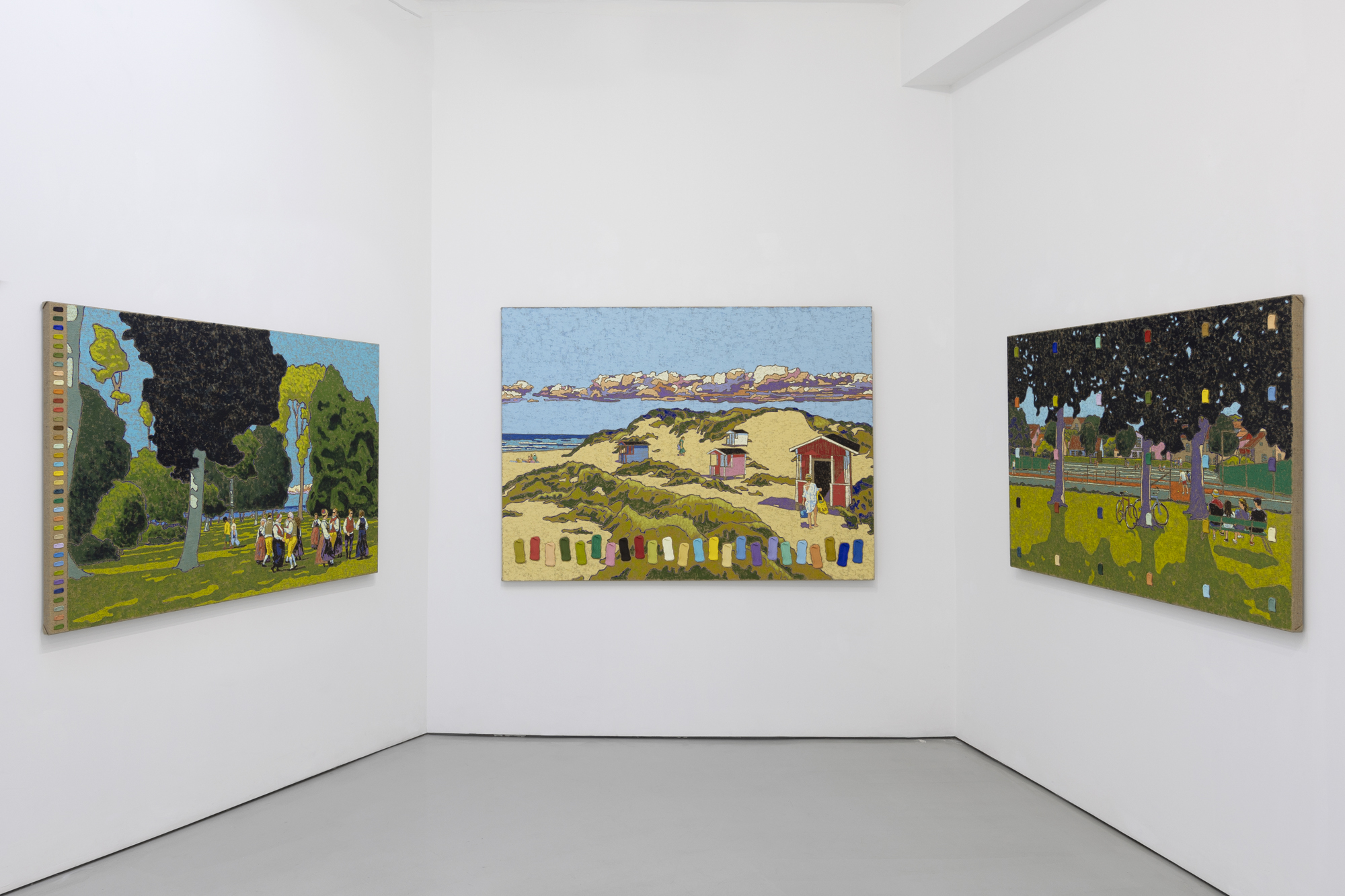 Mohall creates post-impressionistic style landscapes dotted with people enjoying moments of leisure and tranquility. Inspired by Swedish and Norwegian coastlines and countrysides, Mohall documents his observations while on holiday with friends and family. When translating these subjects into paintings, he embraces surfaces like jute which emphasizes texture, and rich palpable colors that simulate a luminosity from within. Uniquely, Mohall also invites the viewer into his artistic process by sharing each color from his palette painted on acrylic casts, and neatly stacked or arranged in the composition. The artworks on view in Parklife cleverly pair the beloved picturesque traditional landscape genre with a distillation of the painting to its most simplistic form, the colorful brushstroke. Here viewers are simultaneously encouraged to experience both the transportative nature of landscapes, and to contemplate the complexity of how each abstract element that composes the painting — the colors, lines, gestures, and forms — contribute to these emotional experiences.