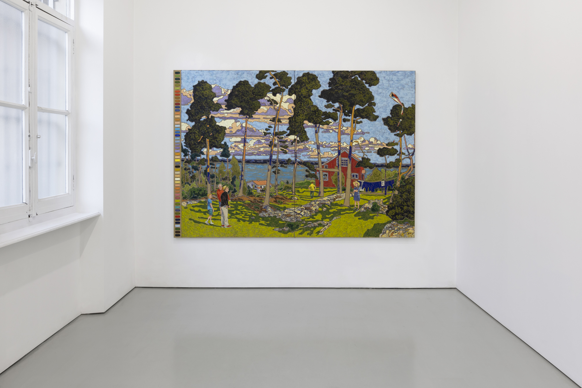 In his large two-panel painting, I Nores Hage (2022), we are welcomed to a red cliffside home and surrounding property with sweeping vistas of the turquoise seaside below. Tall thin trees reach up toward the crystal blue sky filled with pale pink and lavender fluffy clouds. In between the trees five figures, perhaps family members, stand on the sun-kissed chartreuse and shady mossy lawn all gazing in different directions. Each seems to enjoyably take in another part of the epic view standing as upright, still, and almost meditative as the surrounding trees. On the left of the work, the artist has stacked all fifty-three hues used to create the painting, a reminder to the viewer of the complexity and diversity of colors used in the large work. Yet it is ultimately up to the viewer to decide if they choose to dwell in the landscape or contemplate how it was created. “Confidence” is after all “a preference for the habitual voyeur.”