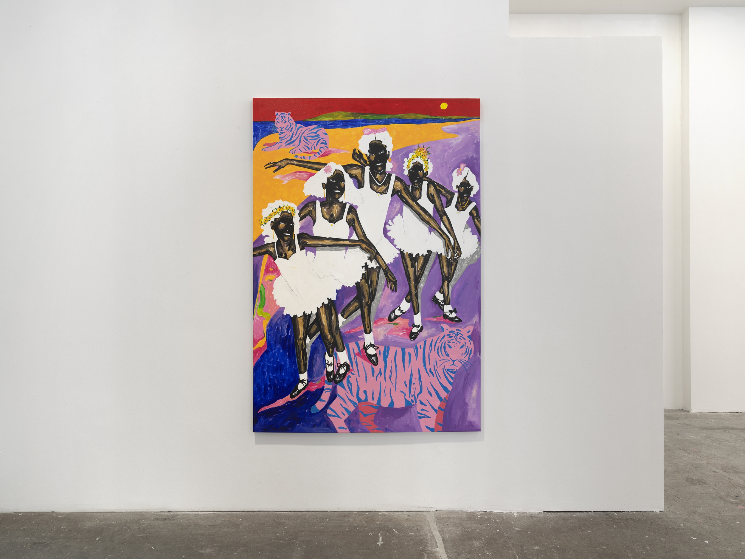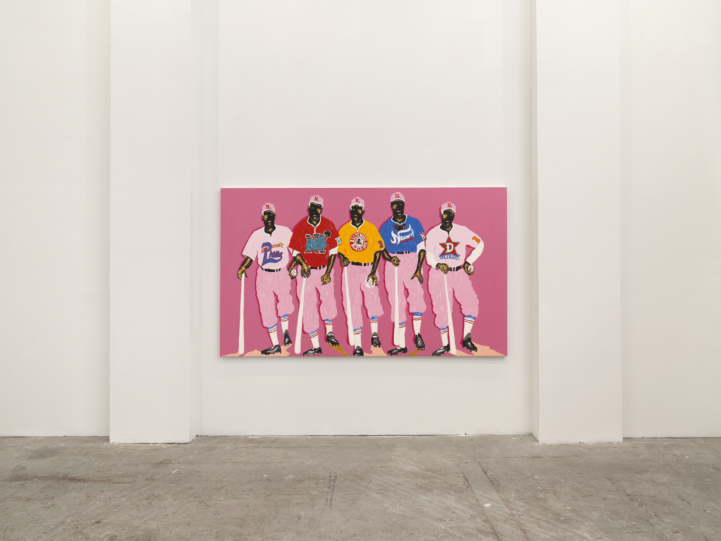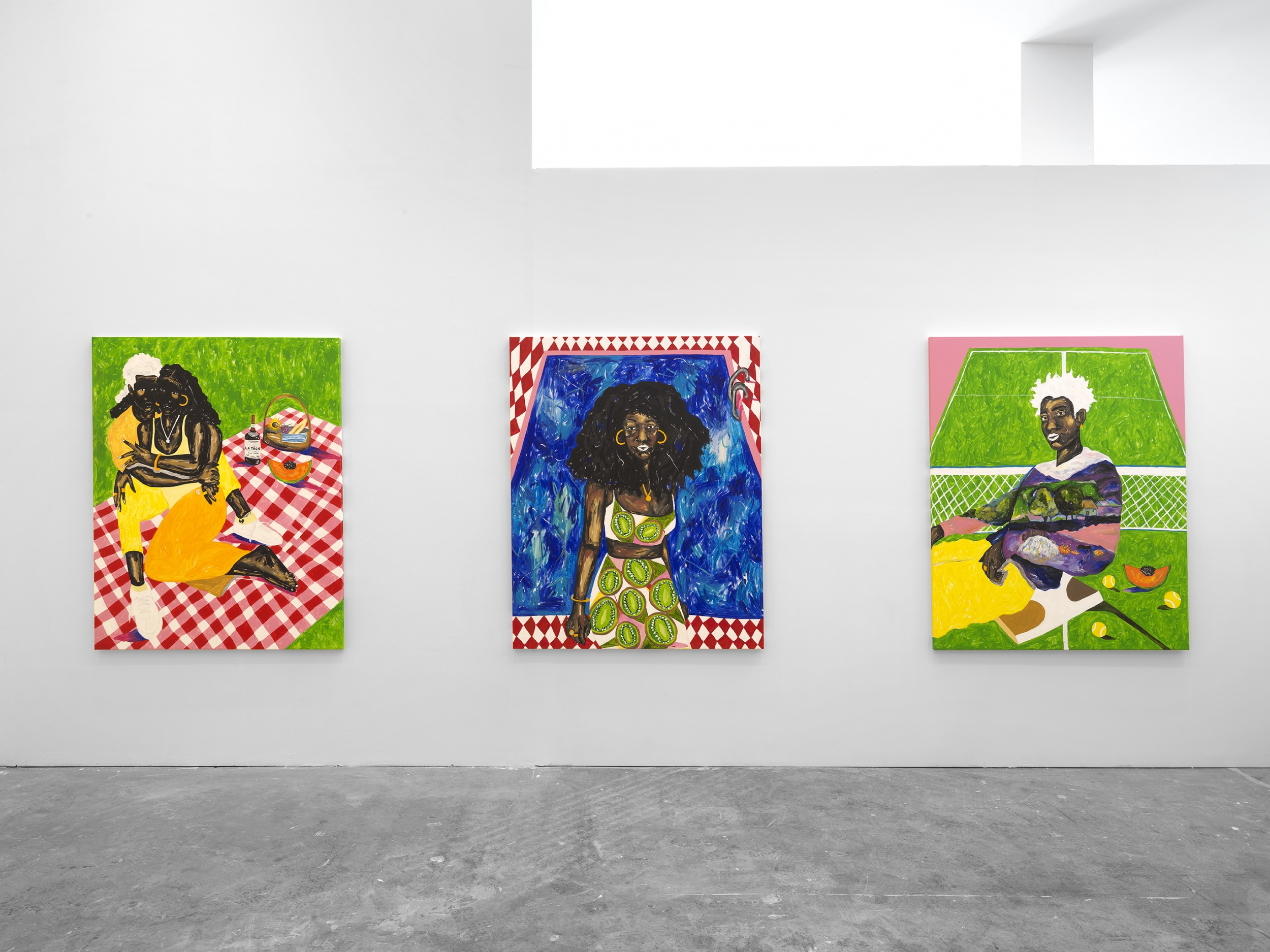 Palito honed his visual lexicon in the streets of Sao Paulo as a muralist creating larger-than-life artworks in his signature pinks and yellows. Utilizing public space as his studio and the walls of buildings around Sao Paulo as his canvas, Palito developed an adroit facility to situate his subject in scenes that articulate Black joy and subvert the oppressive visual language that does seek to uplift Black people. A visual language amplified by traditional and social media that has plagued Black people for centuries depicting them as lazy, unsophisticated, violent, and inhuman. Palito has cultivated a practice that centers Black voices and ruptures traditional stereotypes associated with their bodies, particularly in leisure spaces. By tapping into the Black collective consciousness, Palito shares his view on the Black reality in its fullness - loving, complex, happy, and in community with each other.