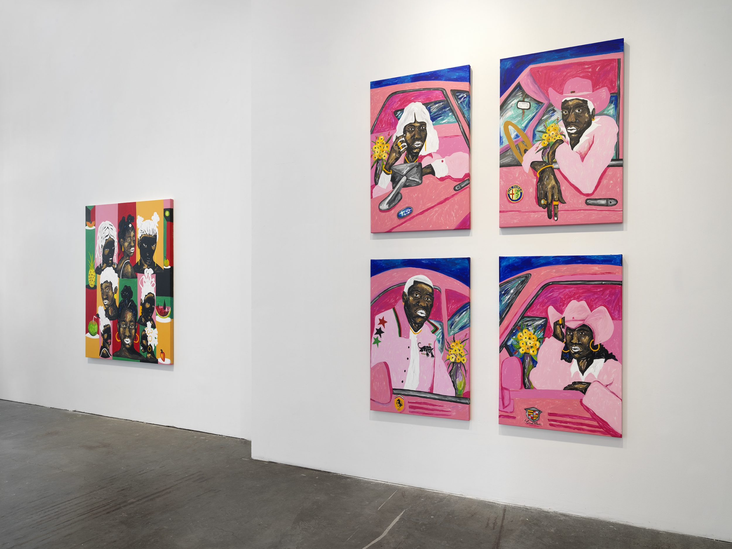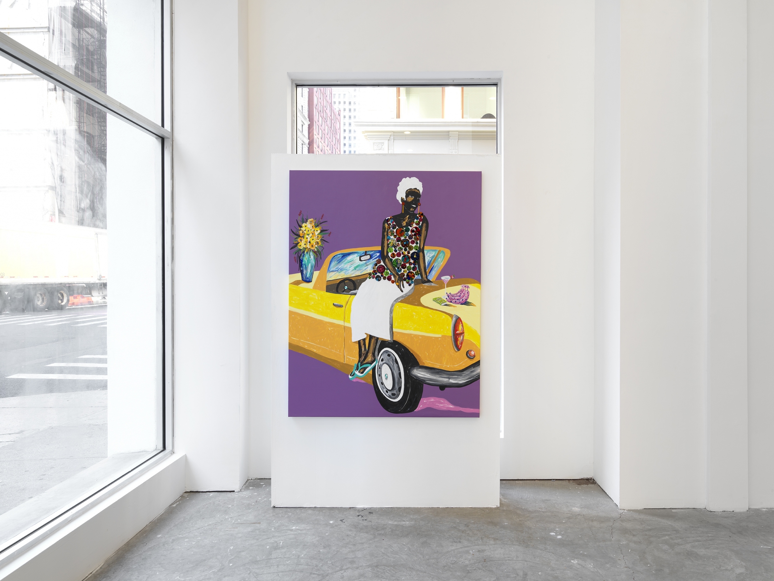 Tropical fruits, animals, cars, and swimming pools, move through a world of vibrant foliage, flowers, and houseplants. Zéh Palito, choosing to represent minority groups, focuses on individuals with a greater intimacy of perspective. He depicts his figures in sync with their surroundings. Through dramatic shifts in scale and highly saturated use of colors, the artist proposes a wonderous utopic vision for the future.