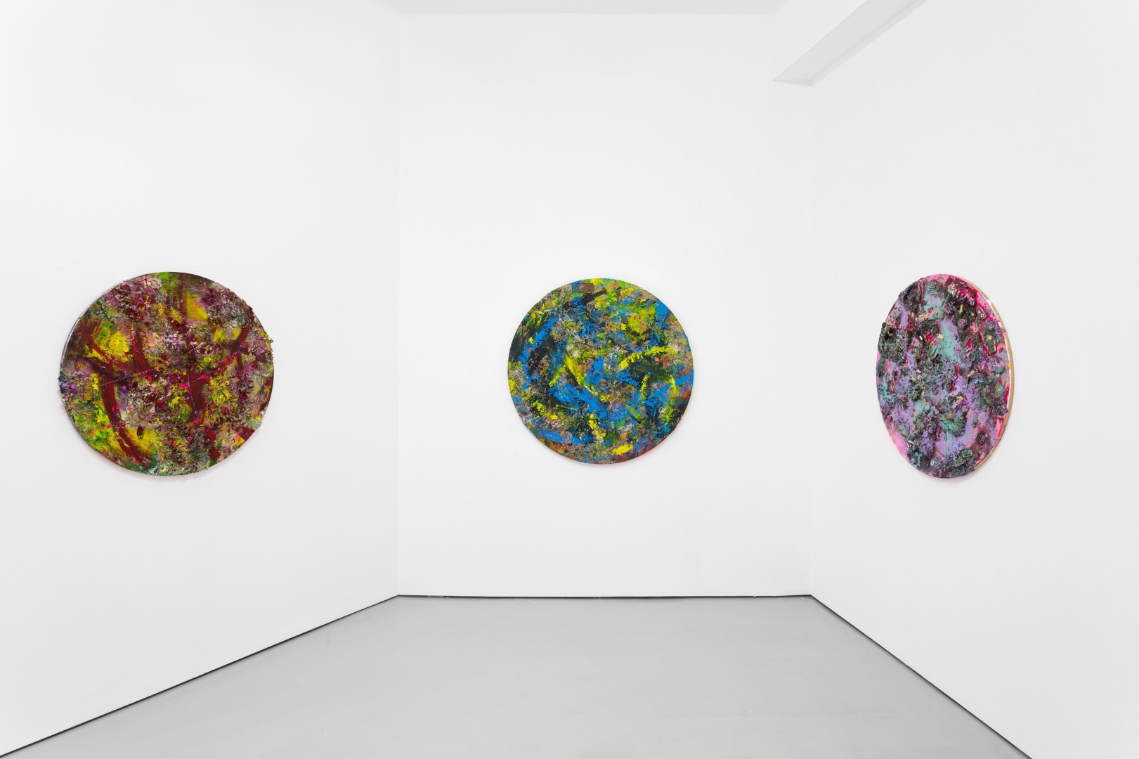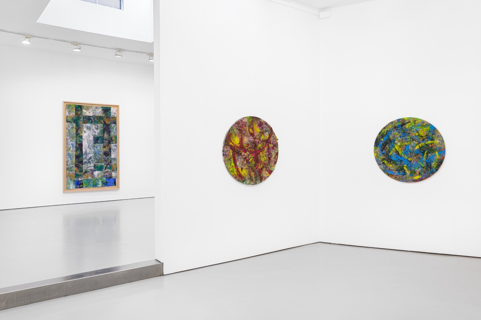 In her captivating tondo painting The Void (2023), Cosbert skillfully paints a luminous backdrop, luring viewers into its embrace with a palette of blush fluorescent pinks and pale minty greens. Upon closer examination, the surface of the painting reveals an intricate landscape composed of mounds of square 'tiles.' These tiles are expertly crafted from recycled materials, including pulverized plastics, crushed dried flowers, and seashells, forming a grid-like structure with textures reminiscent of coral beds. Further energizing the composition are the prominent splatter marks of paint across the surface, a homage to the abstract expressionist action-painting style. However, it is the central motif that truly captivates the observer's attention — a spiral of fallen dominos that gracefully collapses toward the heart of the painting, echoing the circular shape of the tondo. This inclusion of dominos carries profound symbolism, serving a dual purpose. First, it harks back to their historical significance as objects of leisure deeply intertwined with African American culture, dating back to the era of the American Civil War. Second, it embodies the concept of the figurative "domino effect."